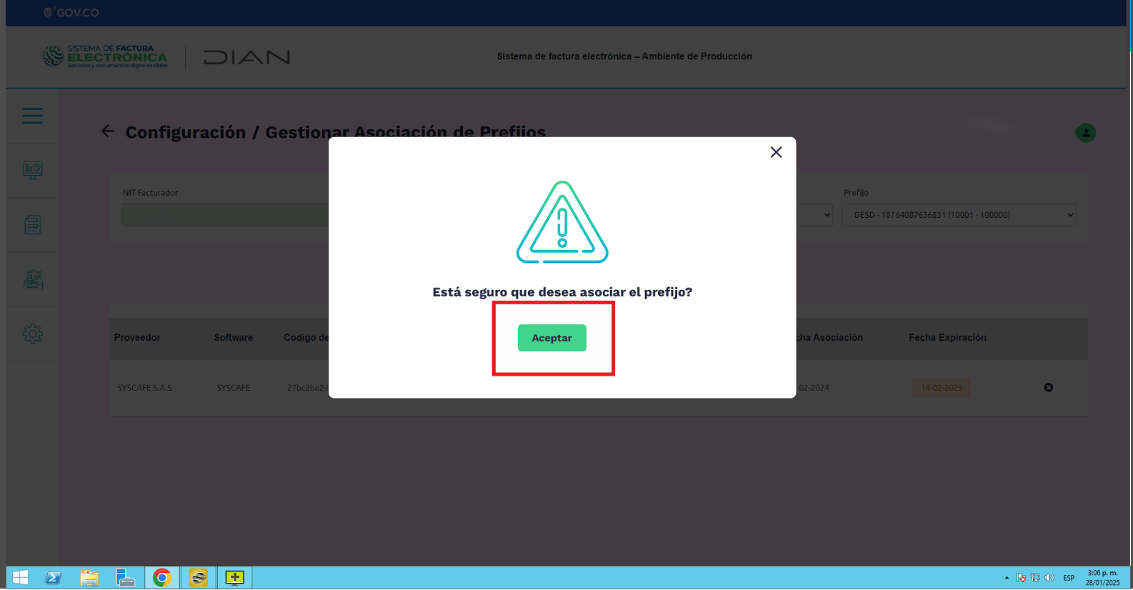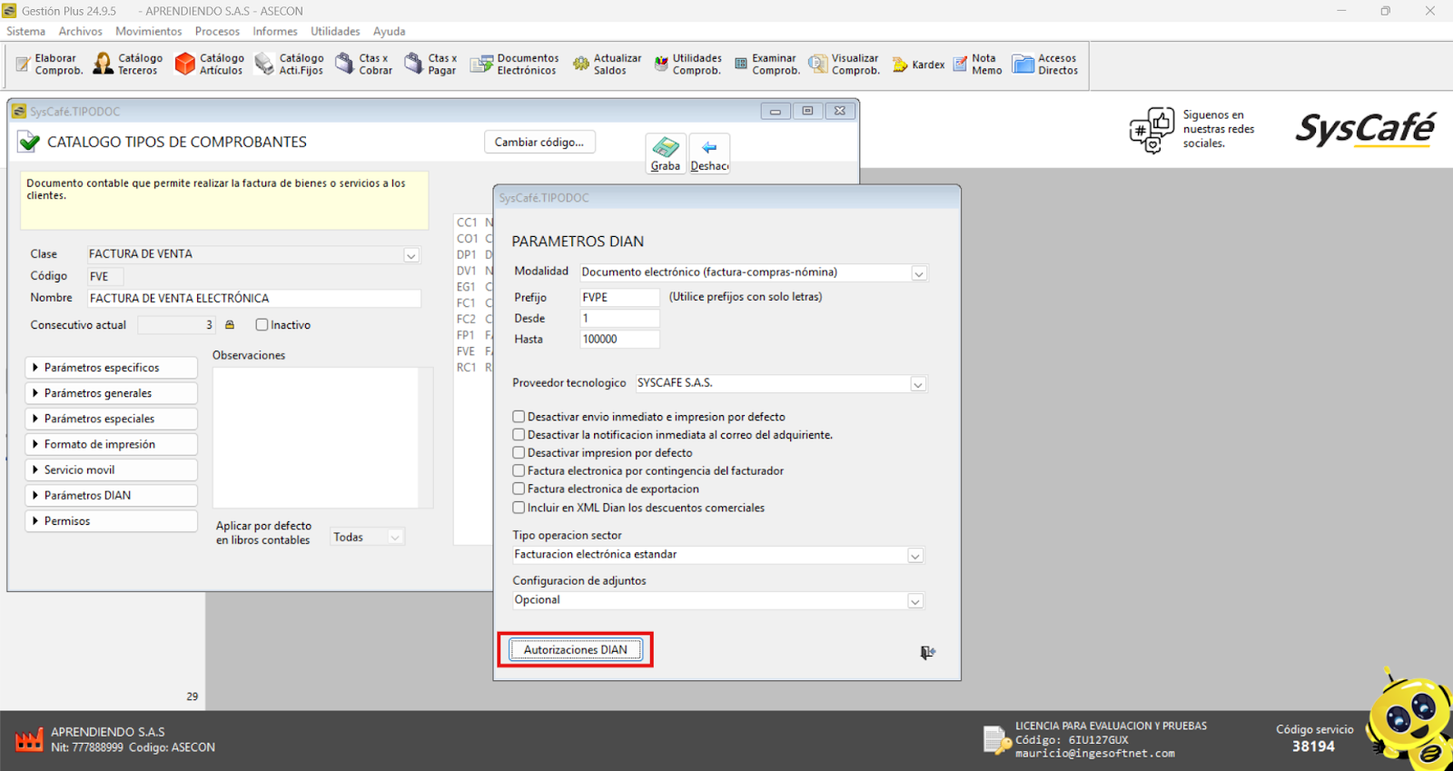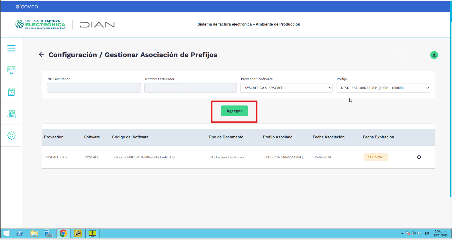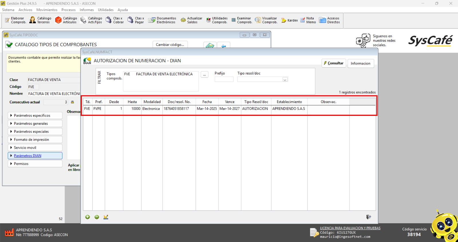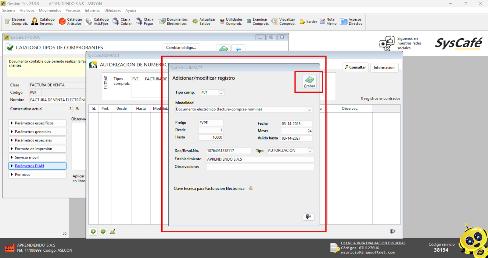 Nota importante: No se ha asociado completamente la información de la resolución DIAN, ya que el proceso para vincular las resoluciones al software SYSCAFÉ se encuentra en otra sección del manual.