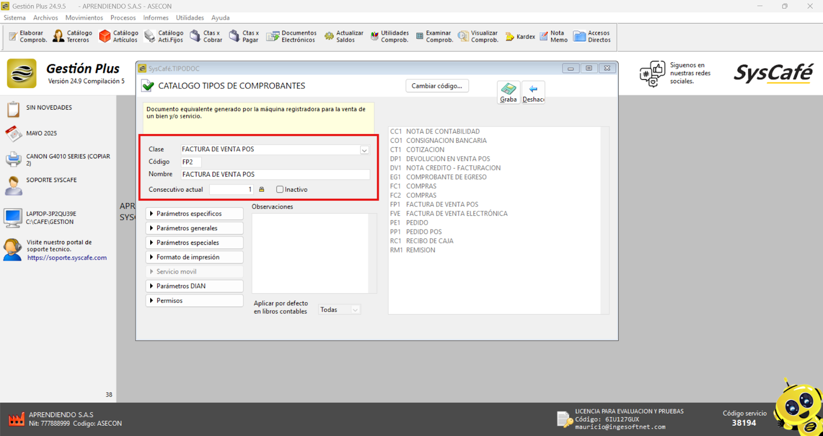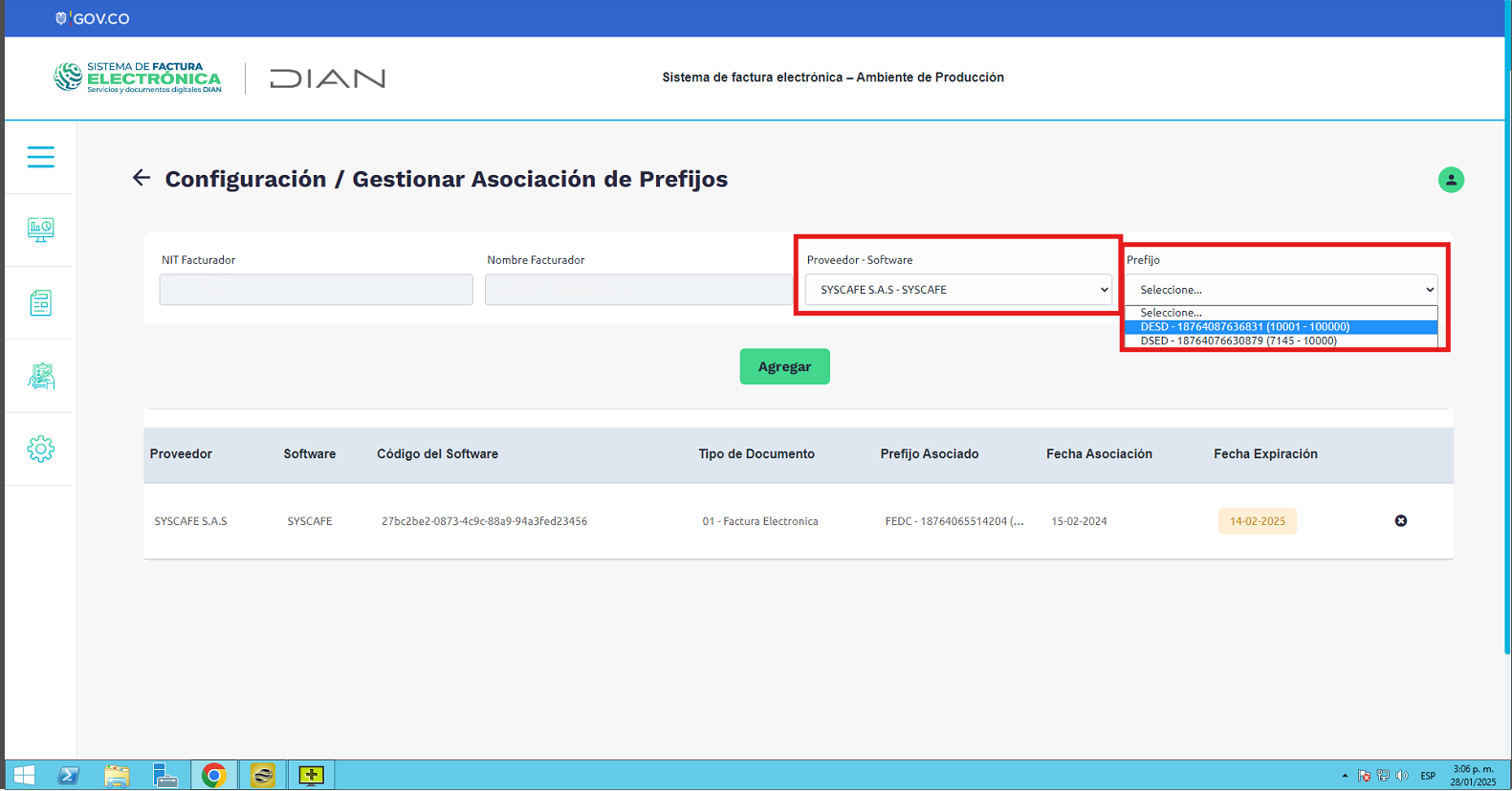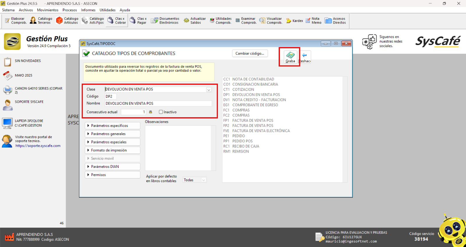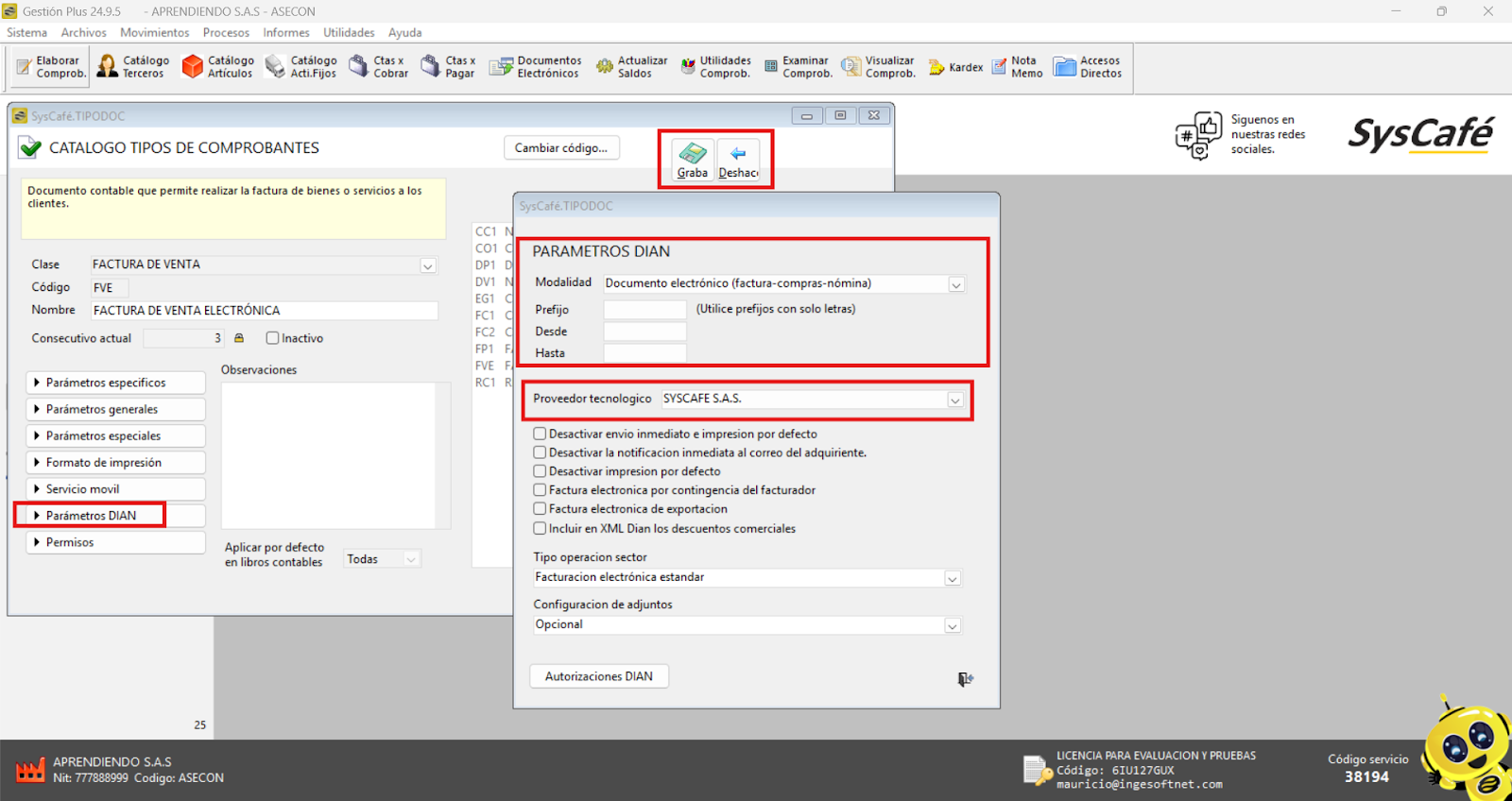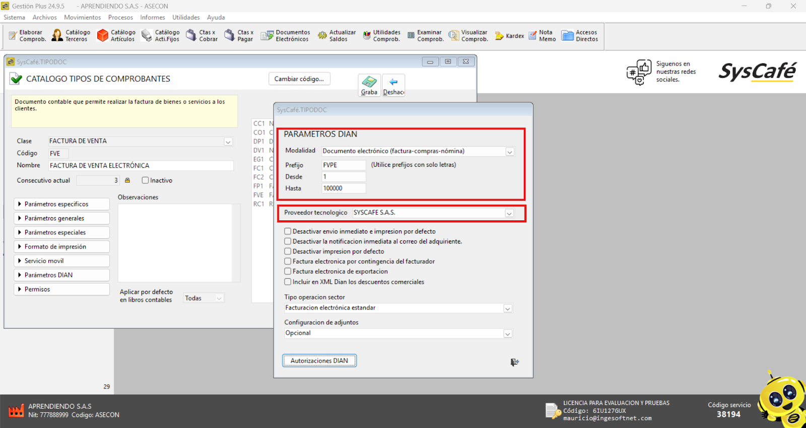 Nota importante: No se ha asociado completamente la información de la resolución DIAN, ya que el proceso para vincular las resoluciones al software SYSCAFÉ se encuentra en otra sección del manual.