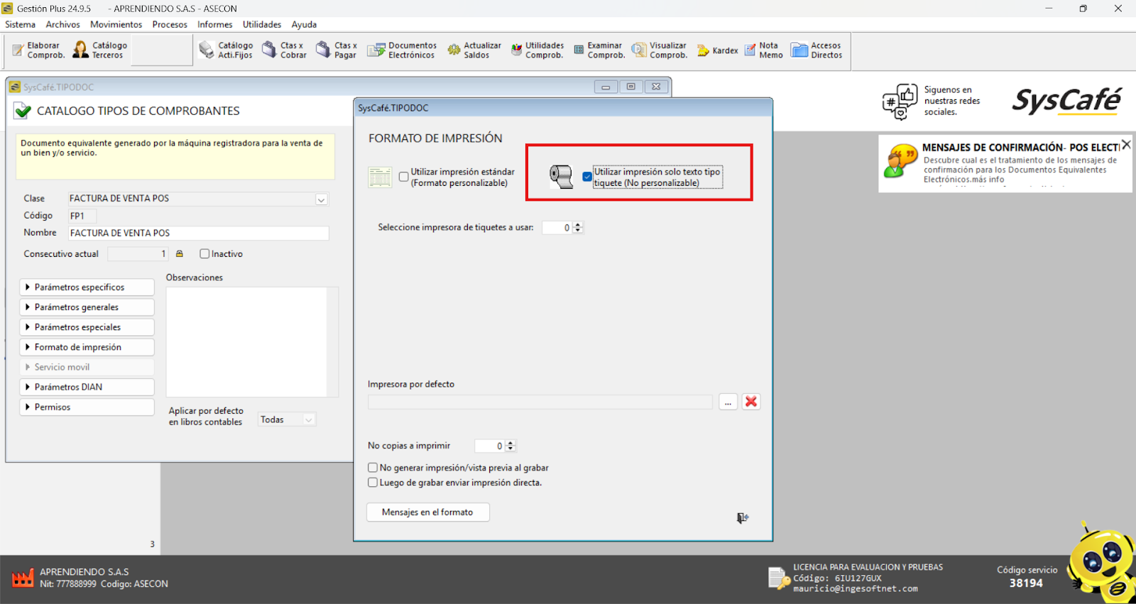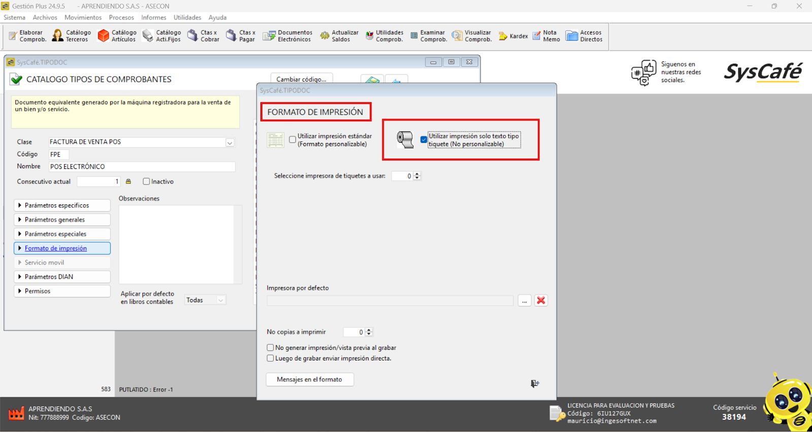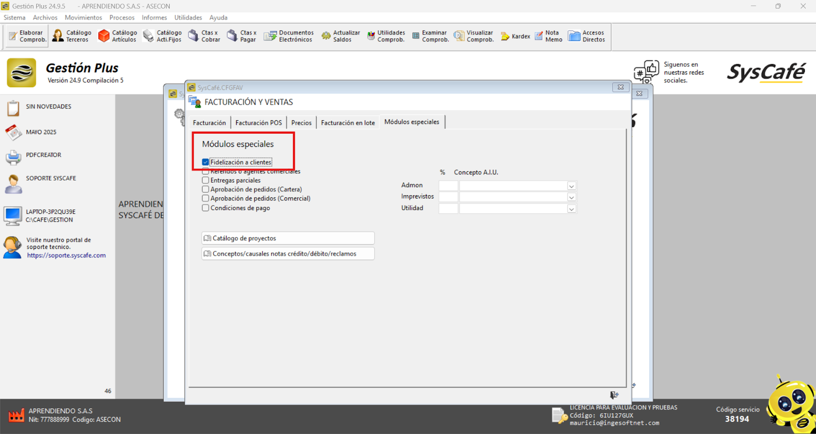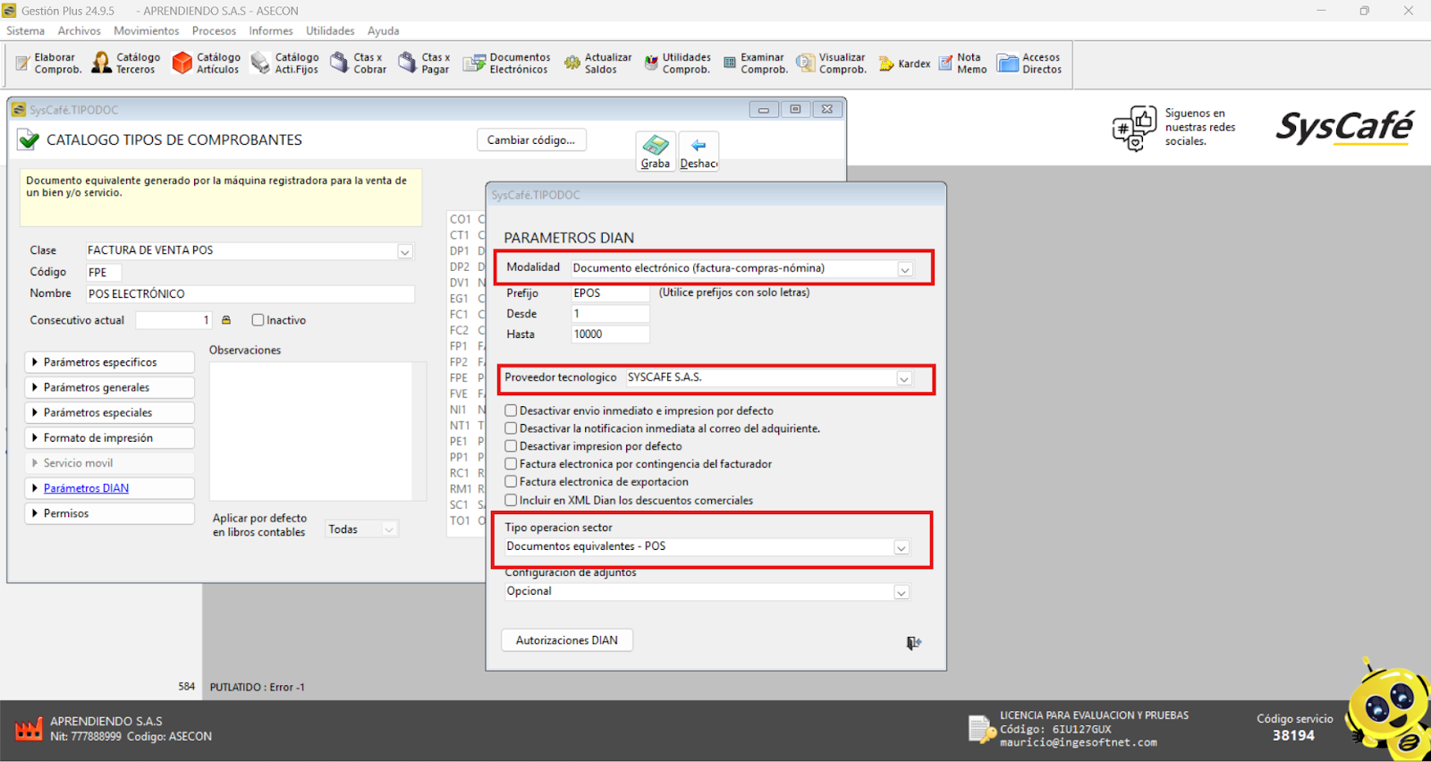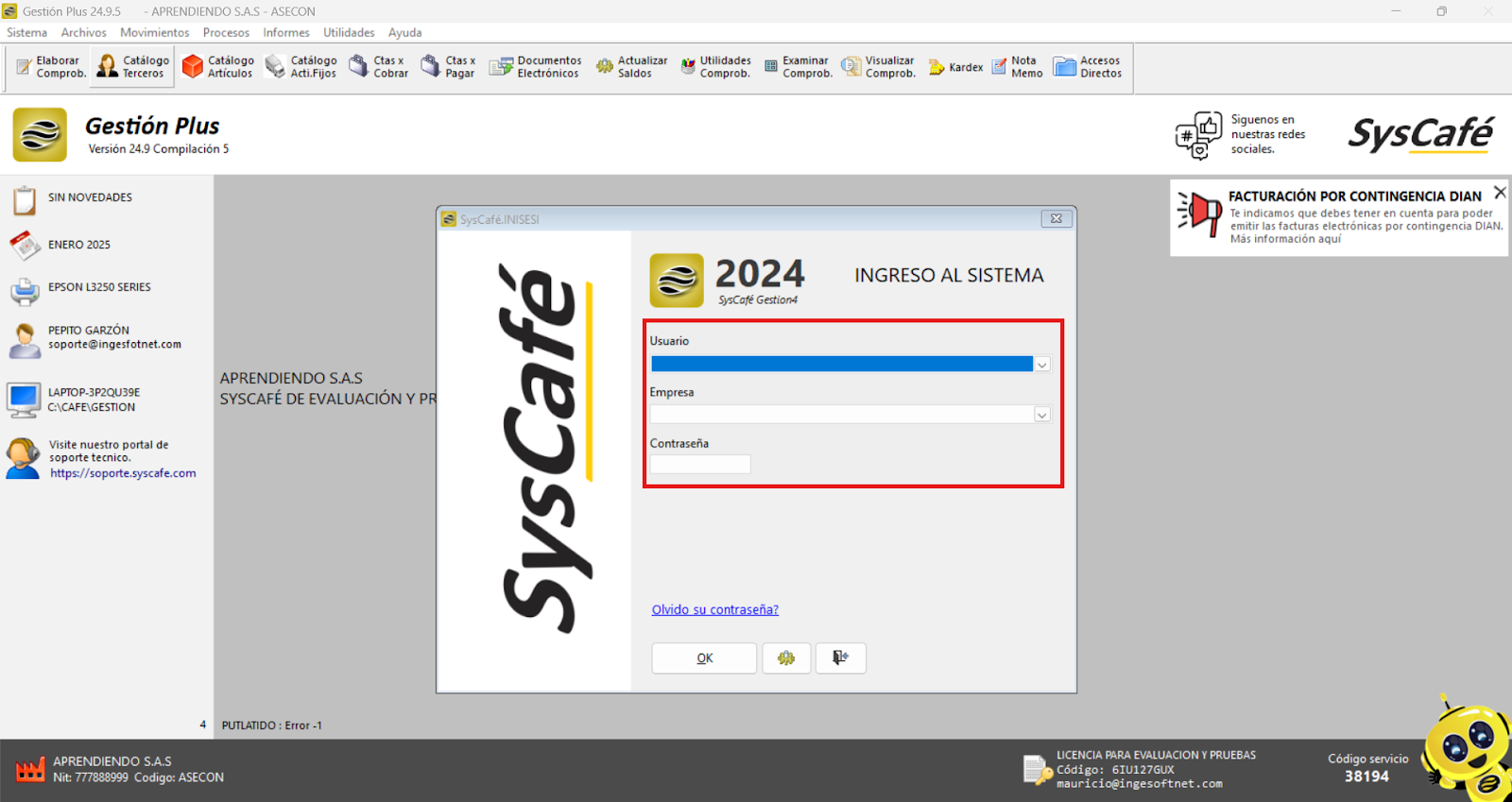 Nota importante: No se ha asociado completamente la información de la resolución DIAN, ya que el proceso para vincular las resoluciones al software SYSCAFÉ se encuentra en otra sección del manual.