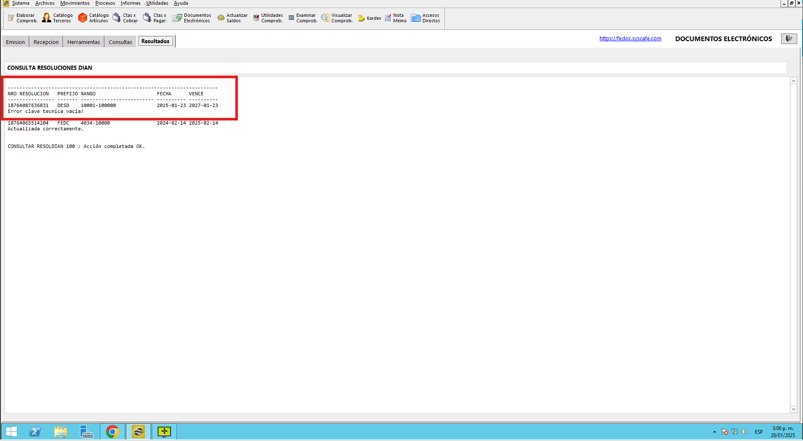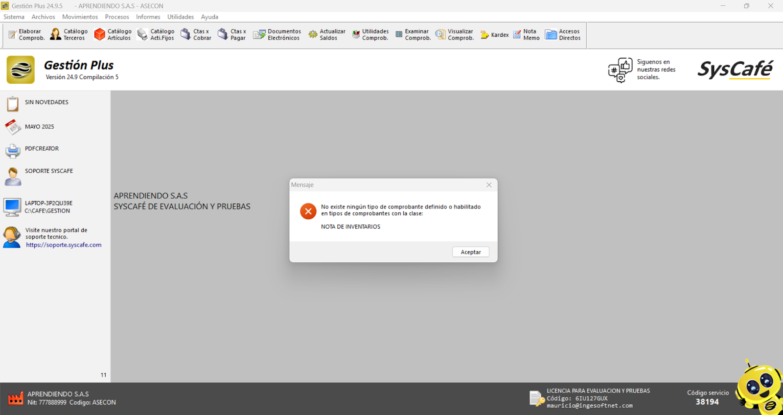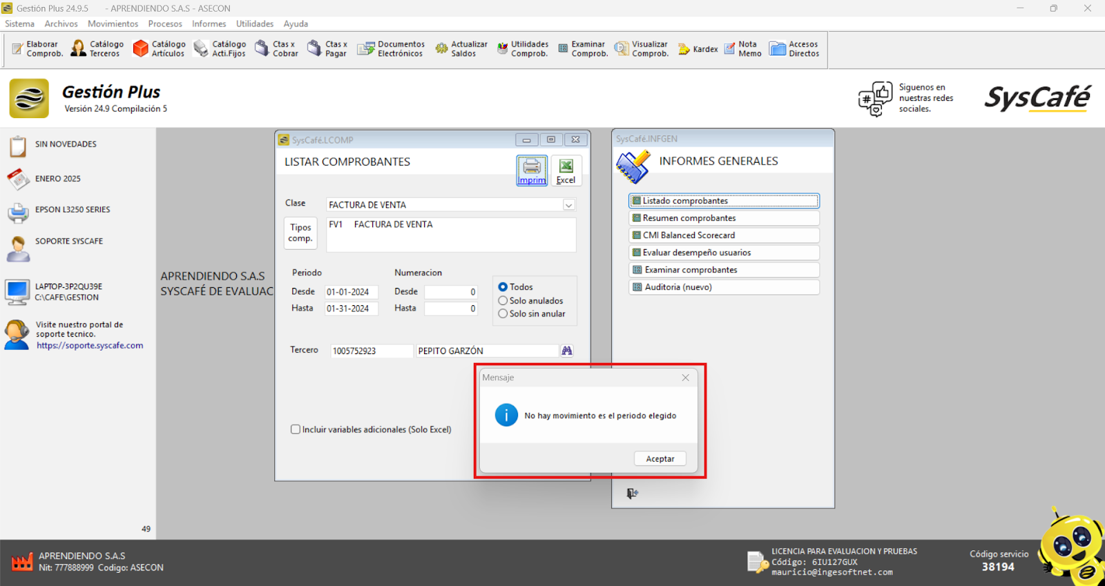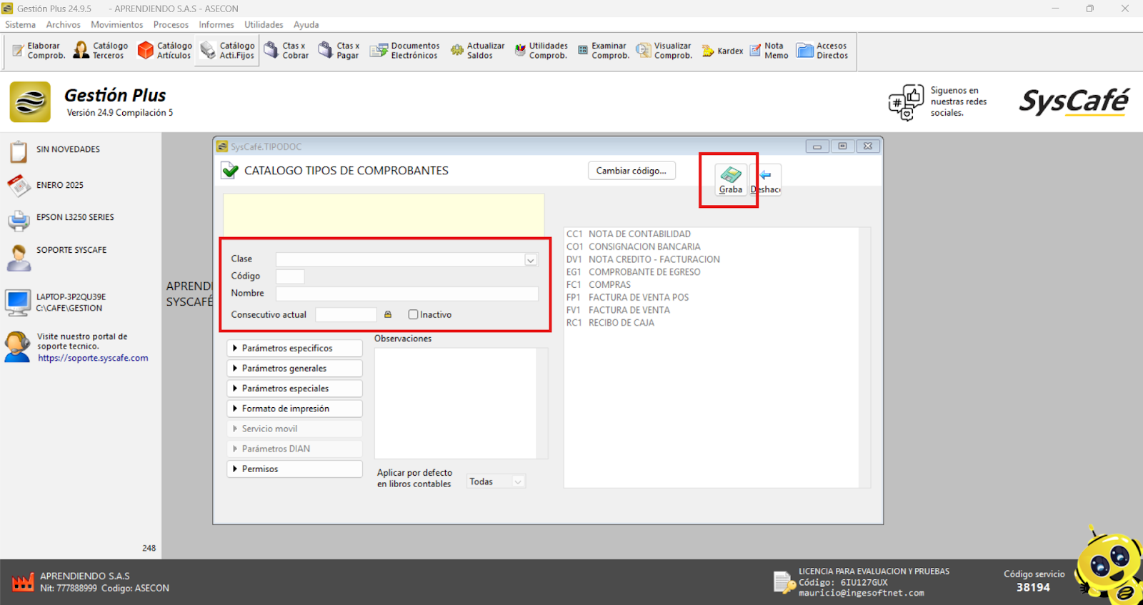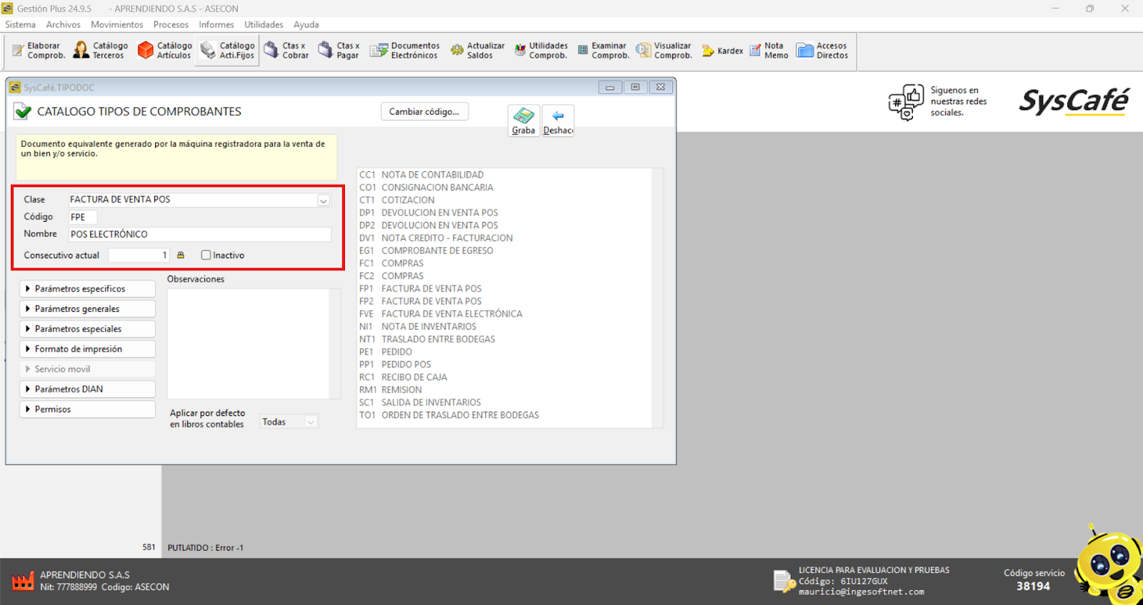 Nota importante: No se ha asociado completamente la información de la resolución DIAN, ya que el proceso para vincular las resoluciones al software SYSCAFÉ se encuentra en otra sección del manual.