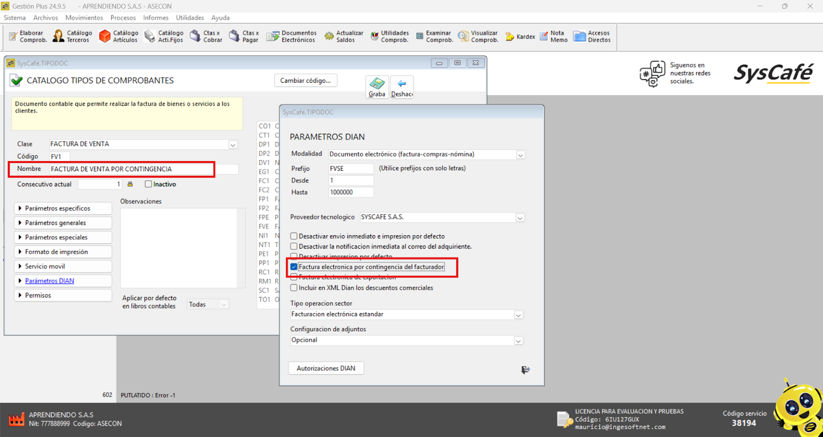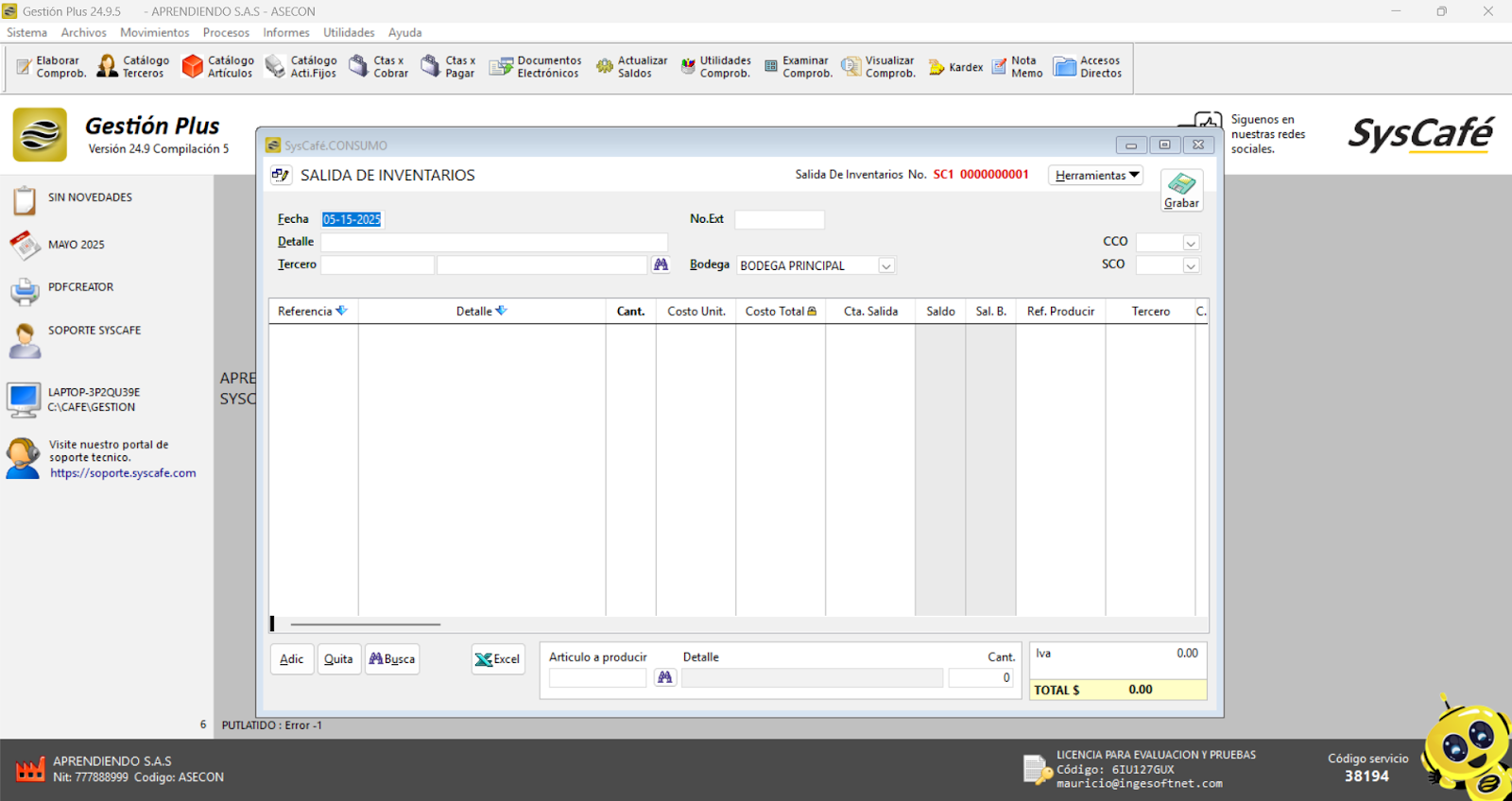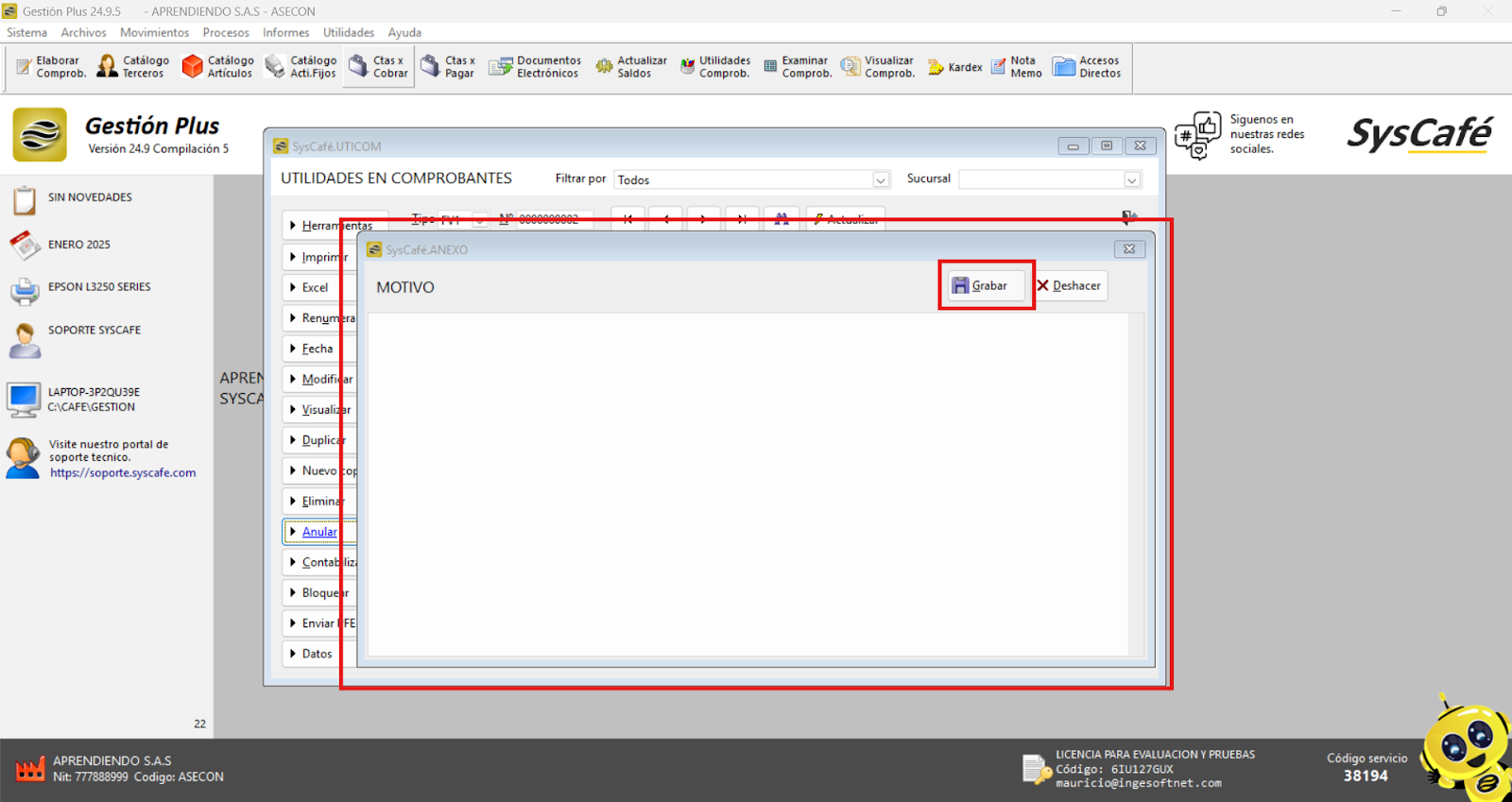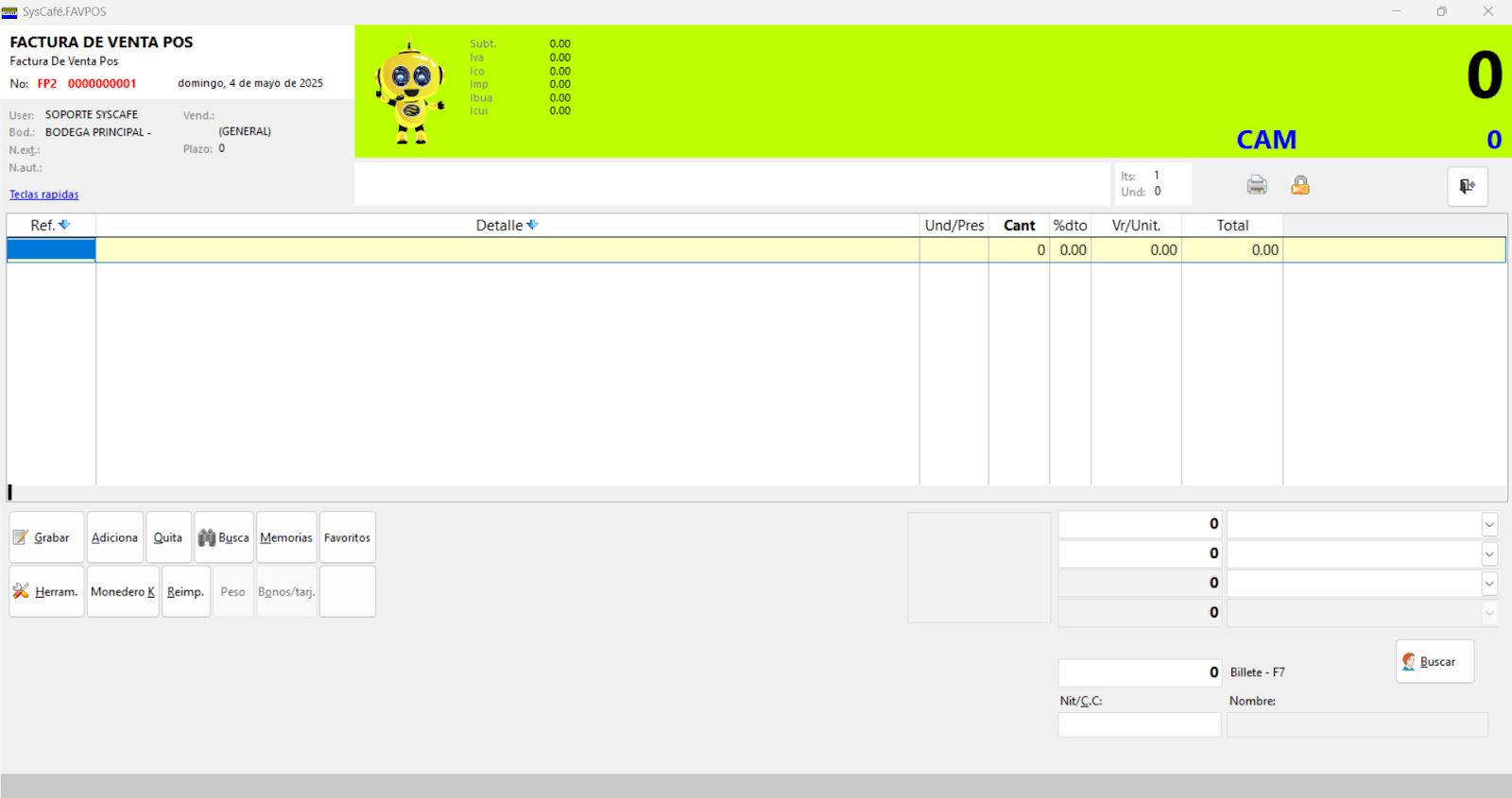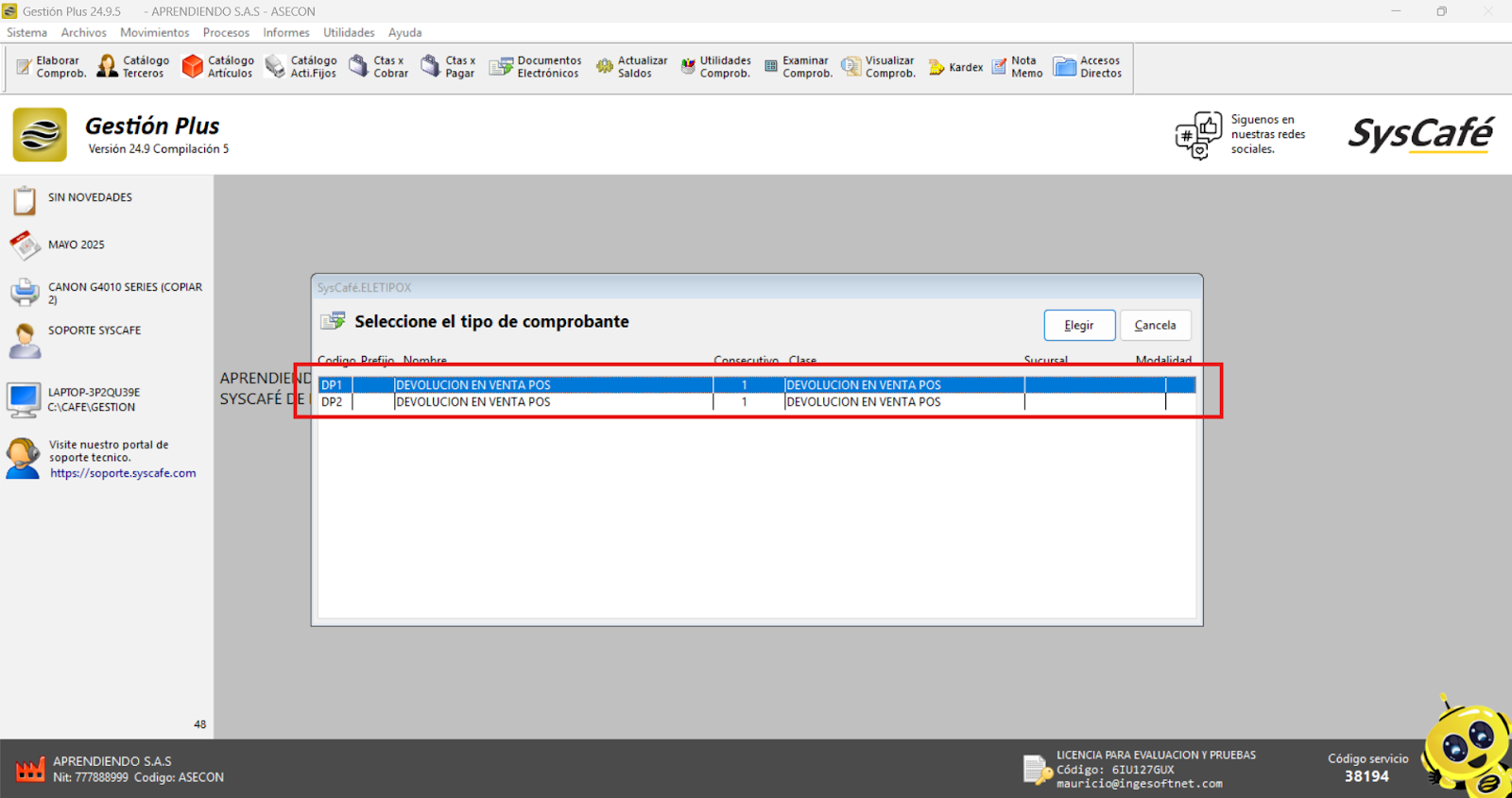 Nota importante: No se ha asociado completamente la información de la resolución DIAN, ya que el proceso para vincular las resoluciones al software SYSCAFÉ se encuentra en otra sección del manual.