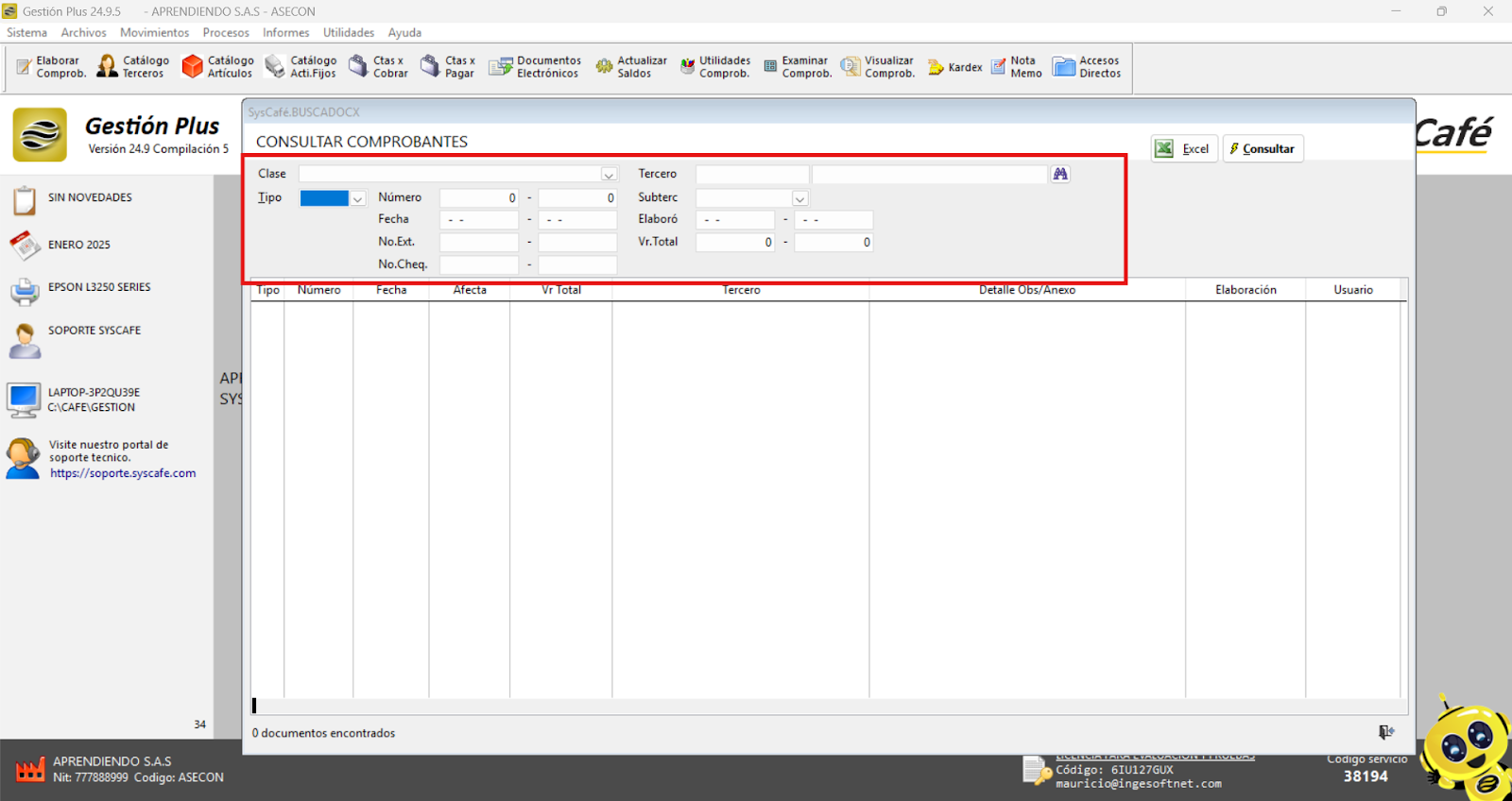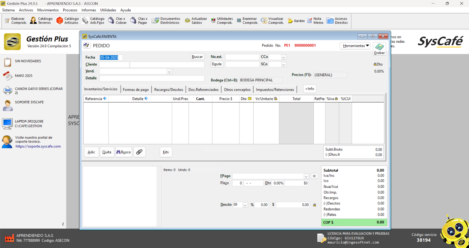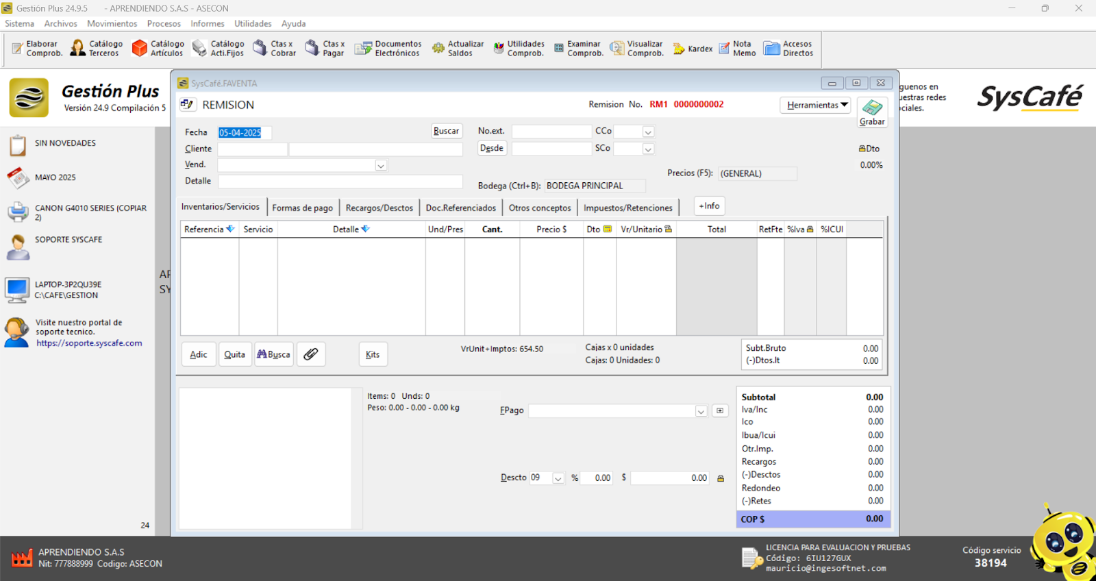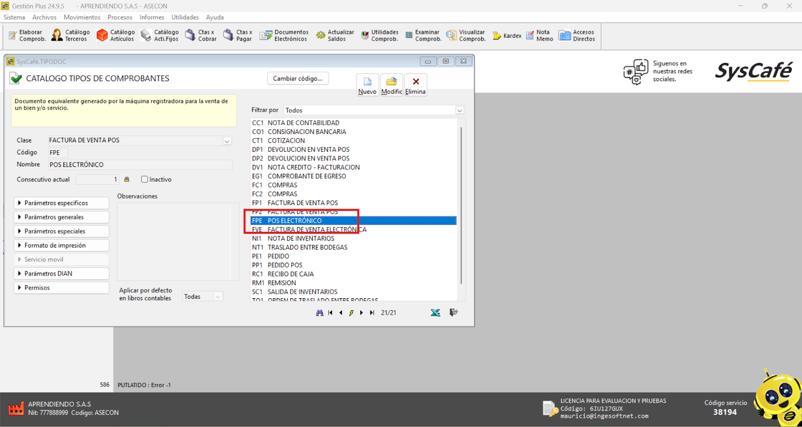 Nota importante: No se ha asociado completamente la información de la resolución DIAN, ya que el proceso para vincular las resoluciones al software SYSCAFÉ se encuentra en otra sección del manual.
