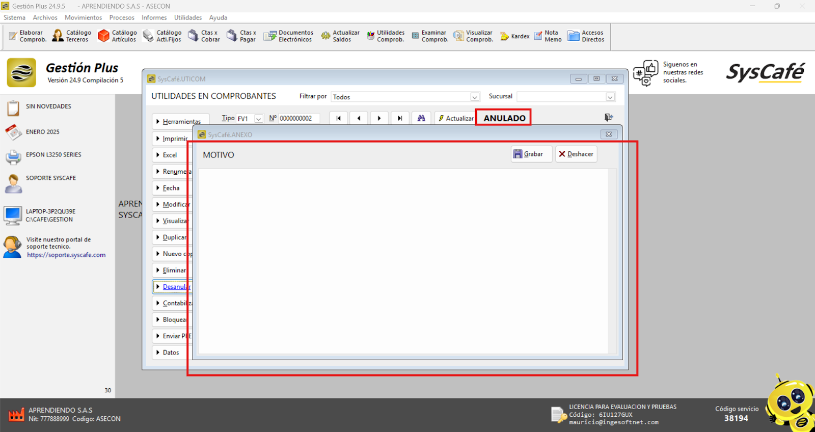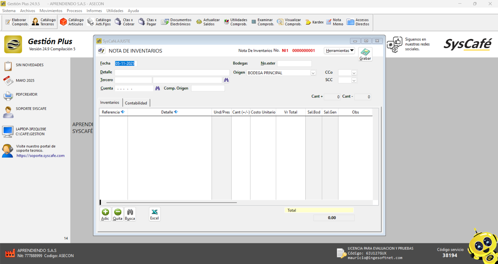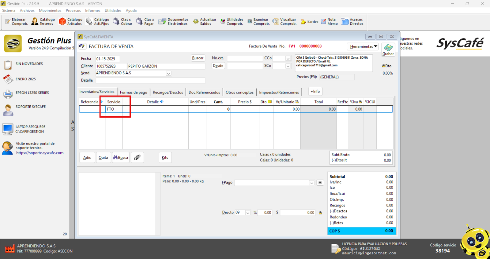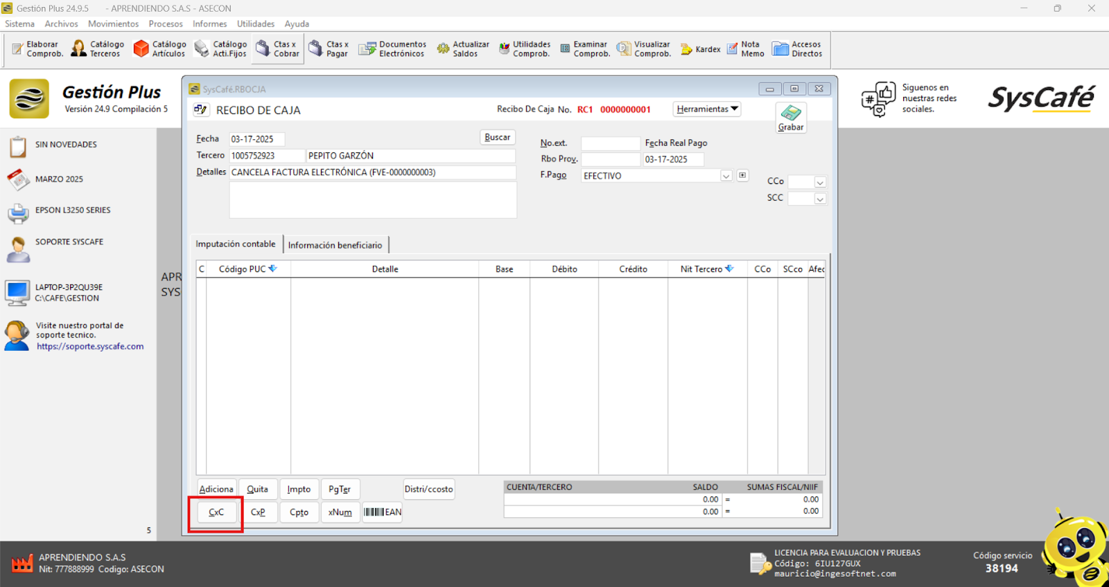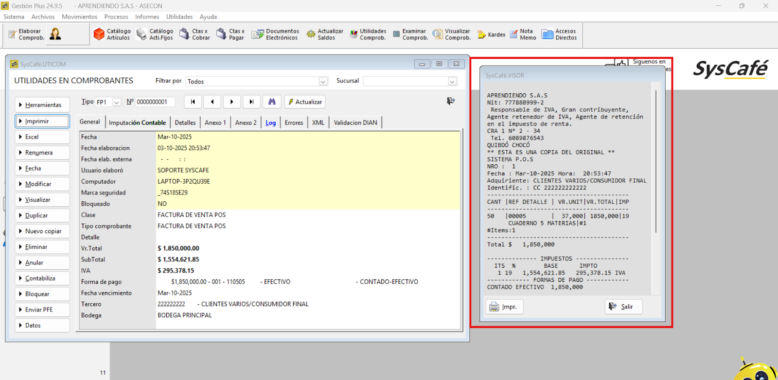 Nota importante: No se ha asociado completamente la información de la resolución DIAN, ya que el proceso para vincular las resoluciones al software SYSCAFÉ se encuentra en otra sección del manual.