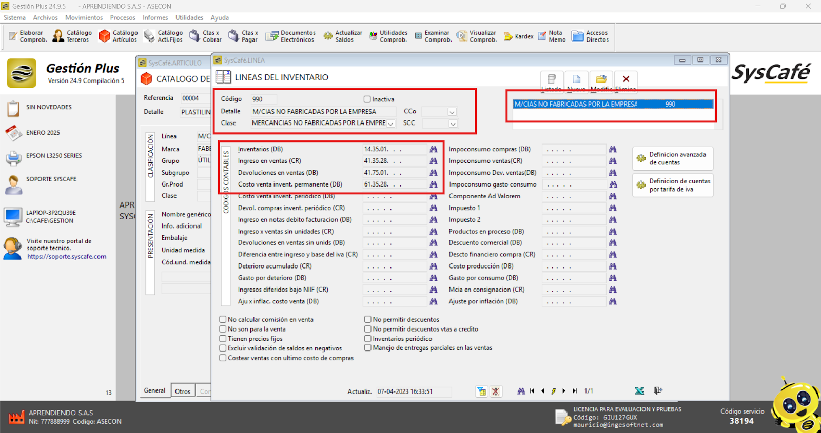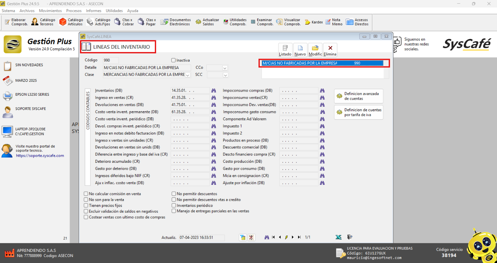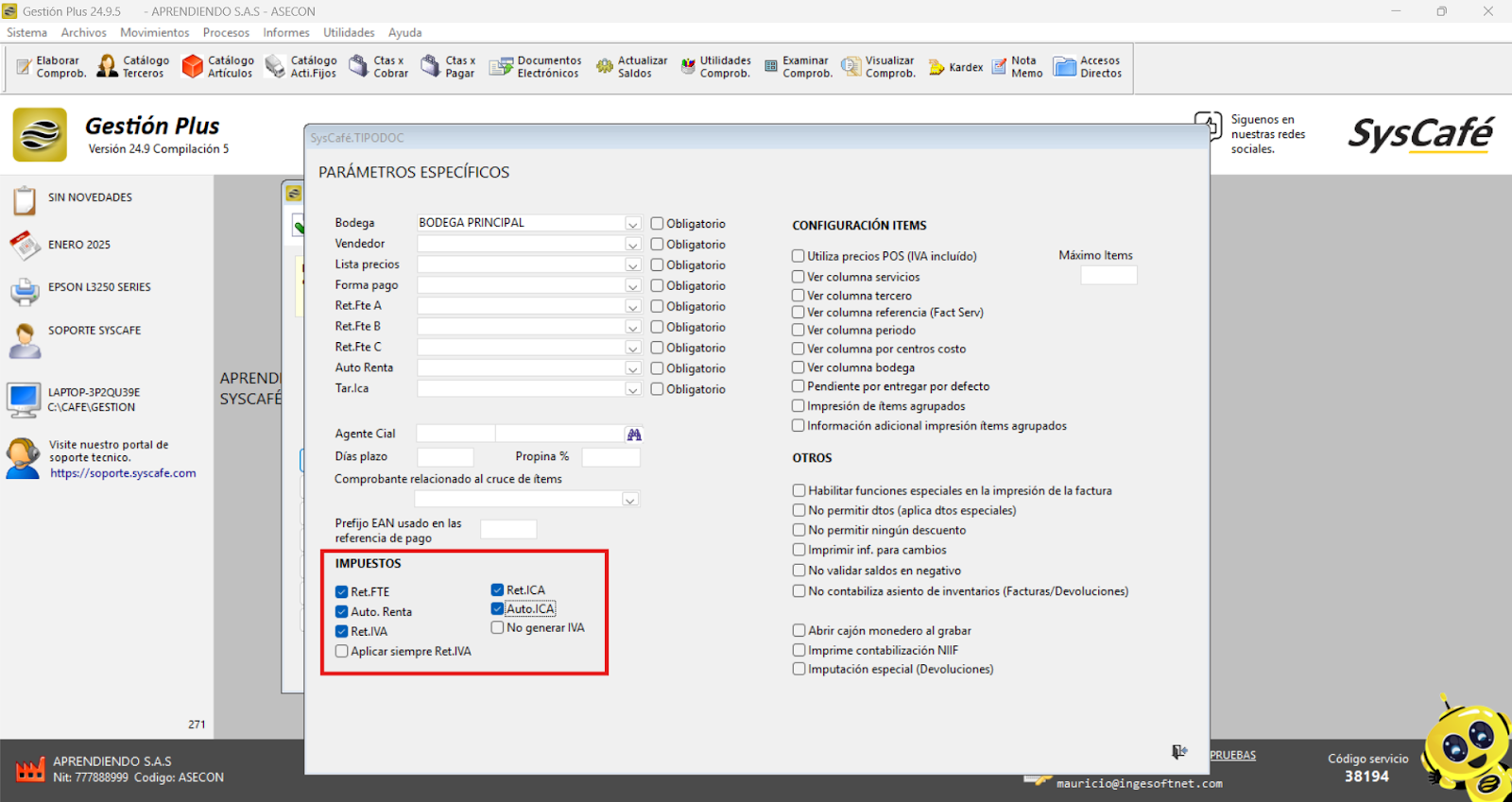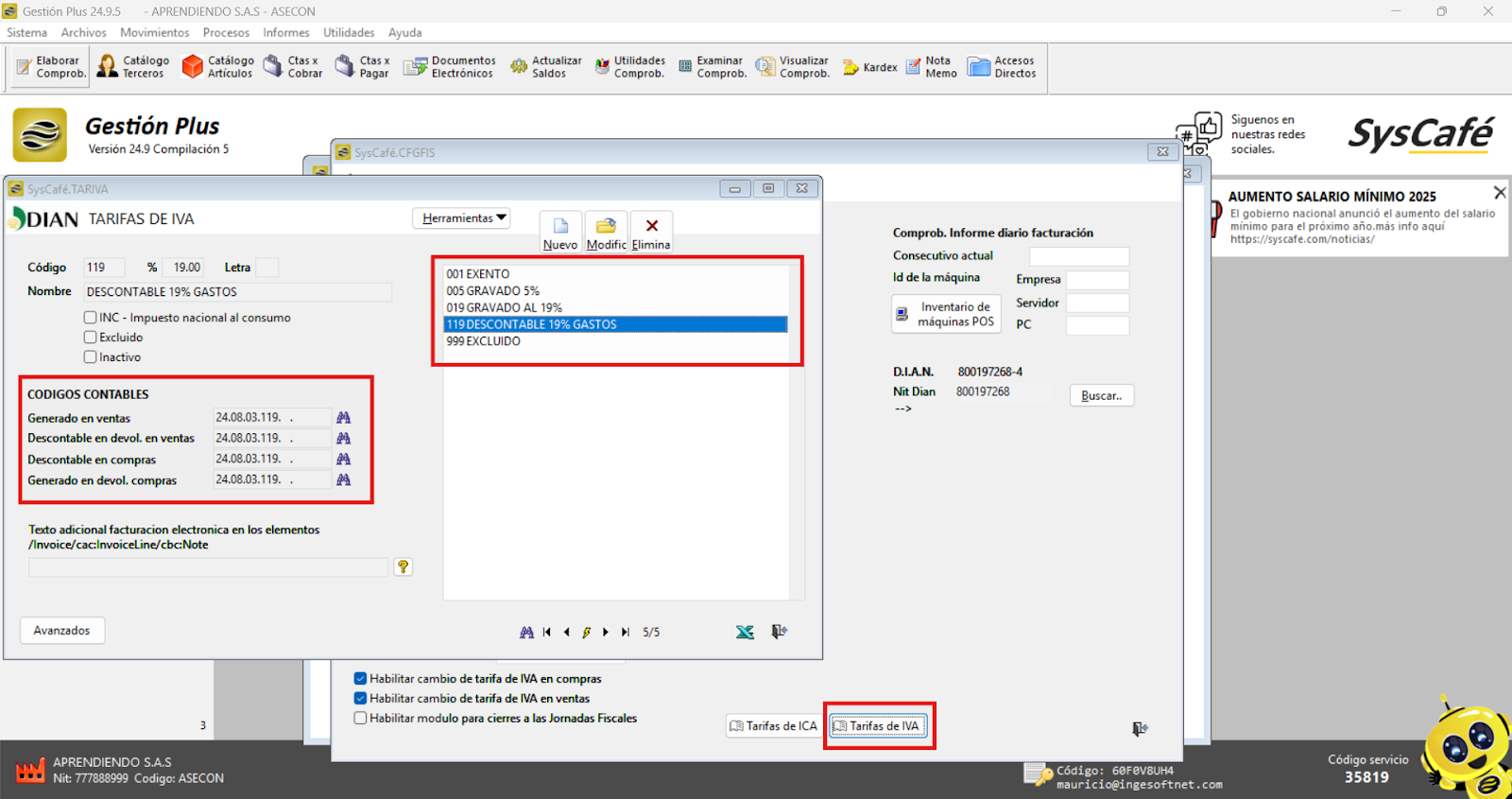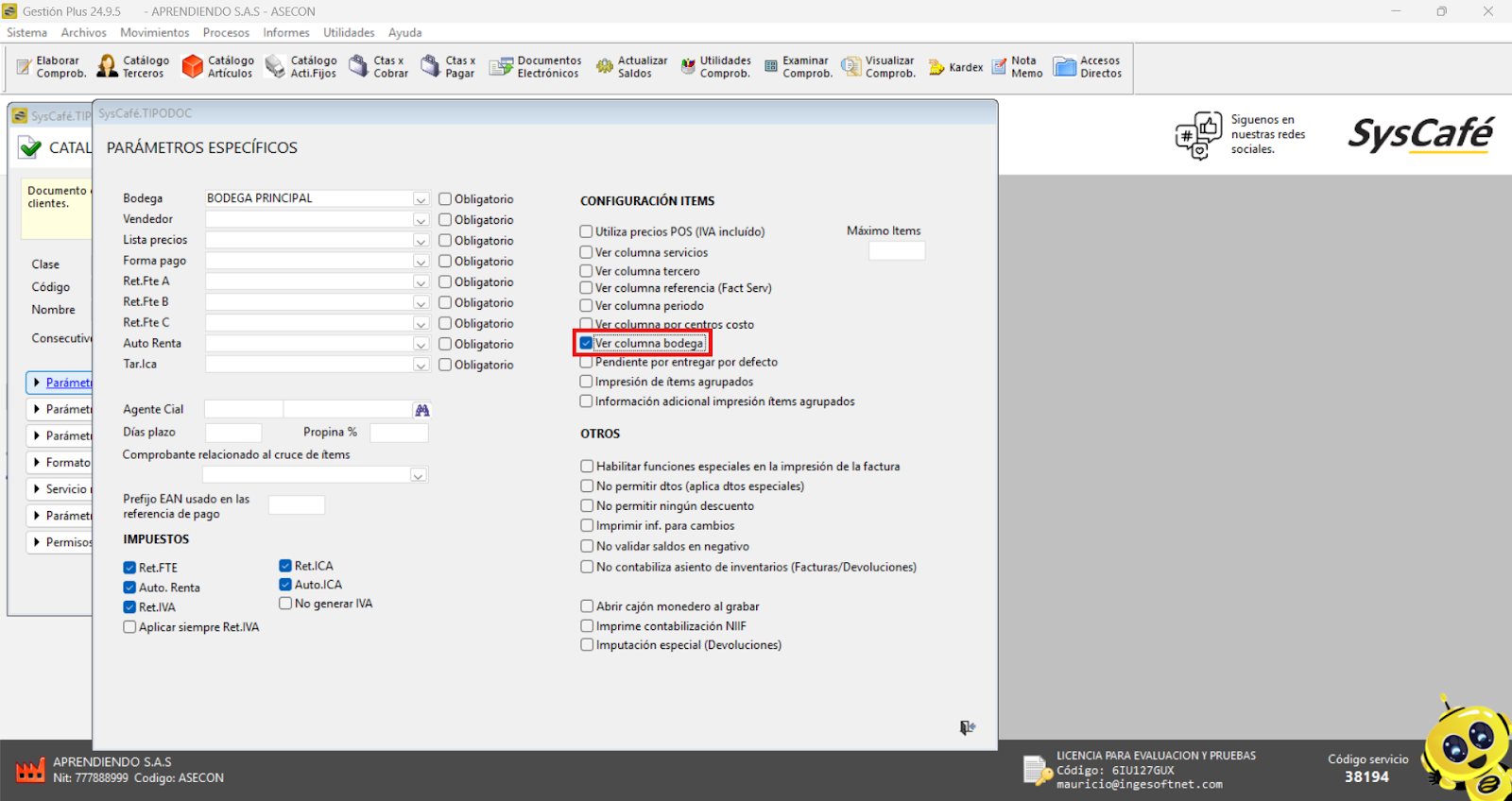 En esta sección, es posible asignar los porcentajes (%) correspondientes, junto con sus respectivos códigos contables. Adicionalmente, el sistema permite la creación y configuración de la tarifa del INC (Impuesto Nacional al Consumo), asegurando que tanto las tarifas como los impuestos estén correctamente parametrizados para cumplir con las normativas fiscales vigentes y facilitar la gestión contable.