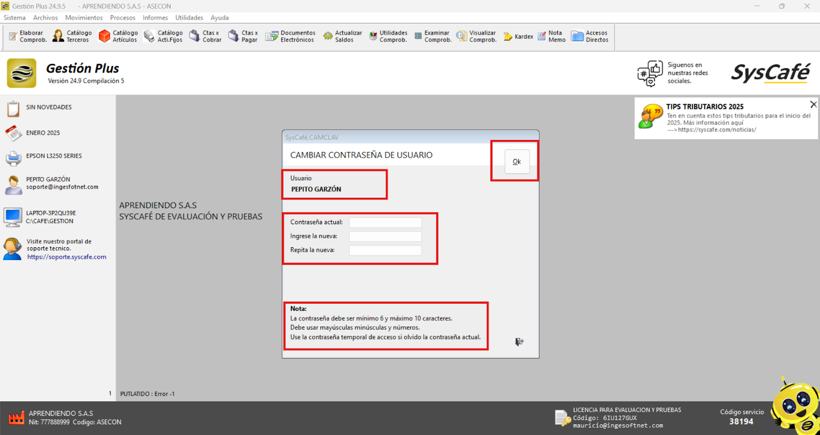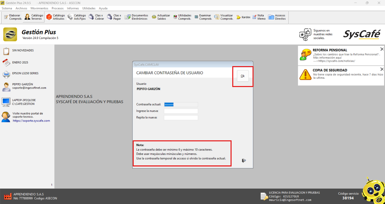Este proceso nos permite acceder al sistema con el usuario que estábamos intentando recuperar. Inmediatamente, aparecerá una ventana para asignar una nueva clave, siguiendo las pautas indicadas en la nota, que establece los requisitos mínimos para garantizar la seguridad de la contraseña.
