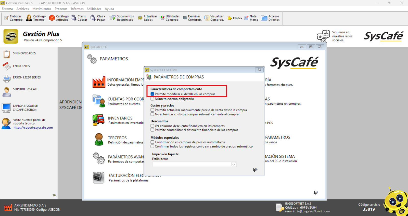 El sistema también ofrece la opción de activar el parámetro que permite modificar el detalle de las compras. Esta funcionalidad brinda a los usuarios la flexibilidad de ajustar la información detallada de las compras directamente desde el sistema.