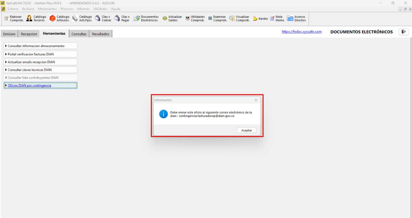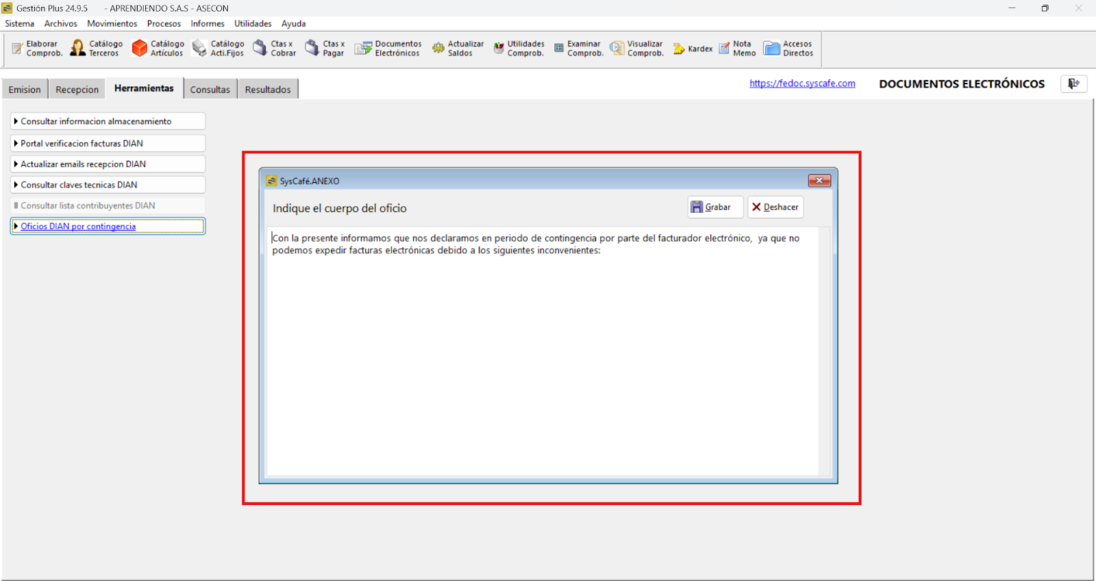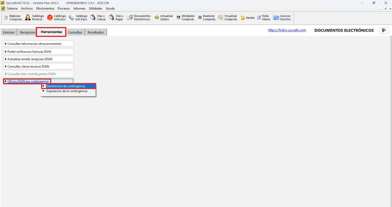 Ruta: Documentos electrónicos - Pestaña (Herramientas) - Botón Oficios DIAN por contingencia - Declaración de Contingencia.