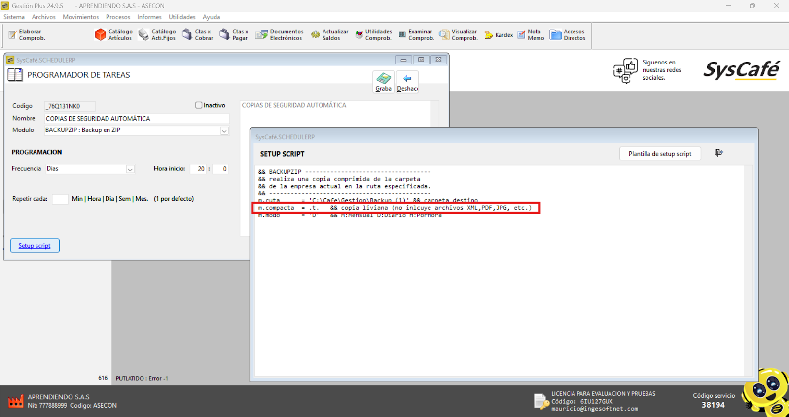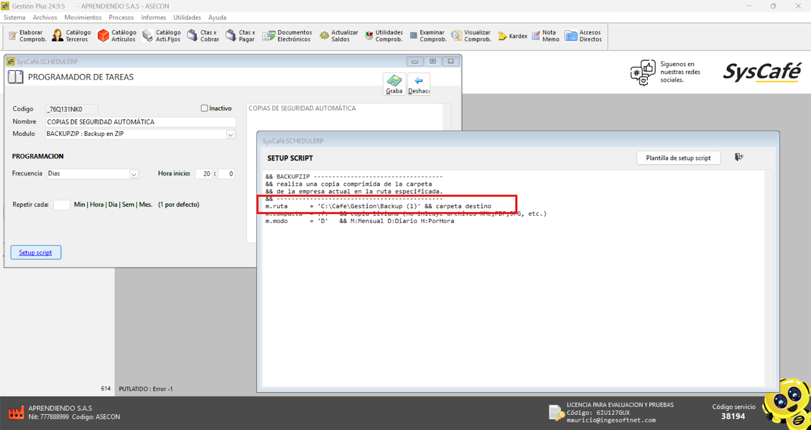 Al hacer clic en el botón Setup Script, se abrirá una ventana para configurar la ruta donde se almacenará la copia de seguridad.