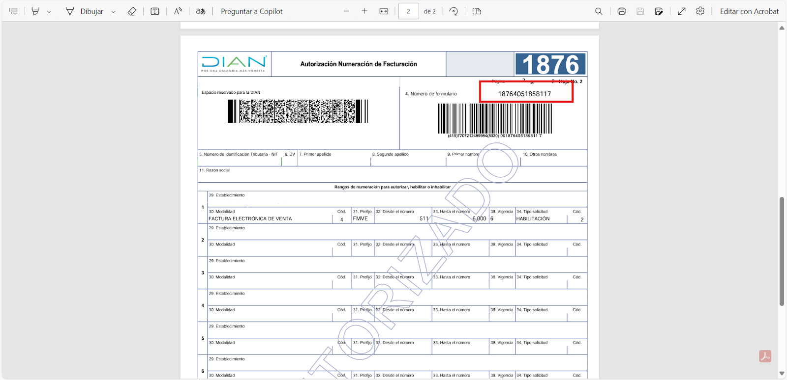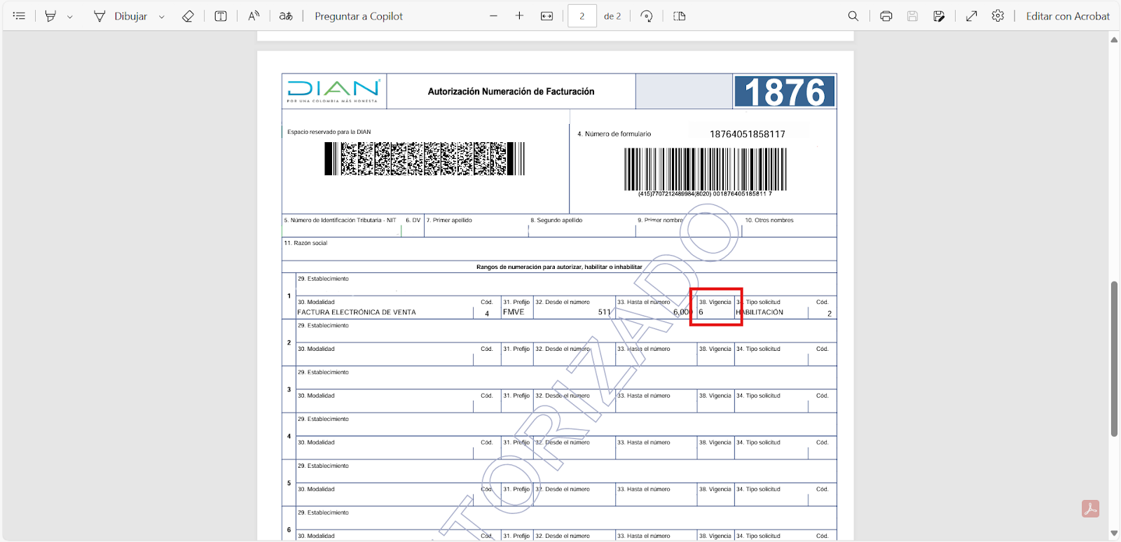 En los campos Prefijo - Desde y Hasta, ingresa la información exactamente como aparece en la resolución.