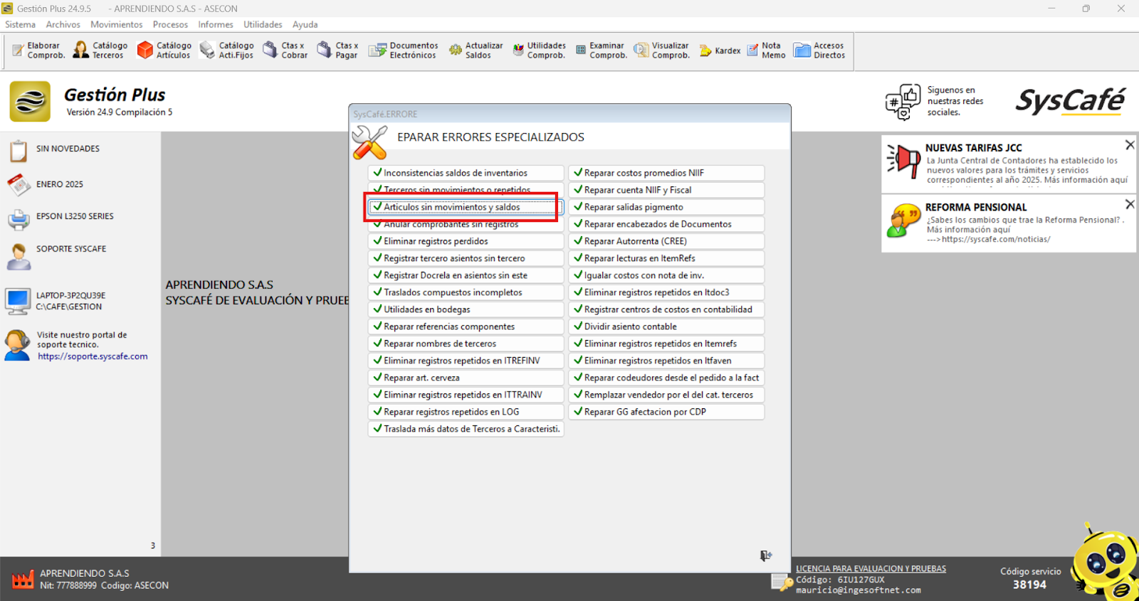 Ruta: Utilidades - Revisión y Auditoría - Buscar errores - Reparaciones Errores Especializados - Artículos sin movimiento y sin saldo.