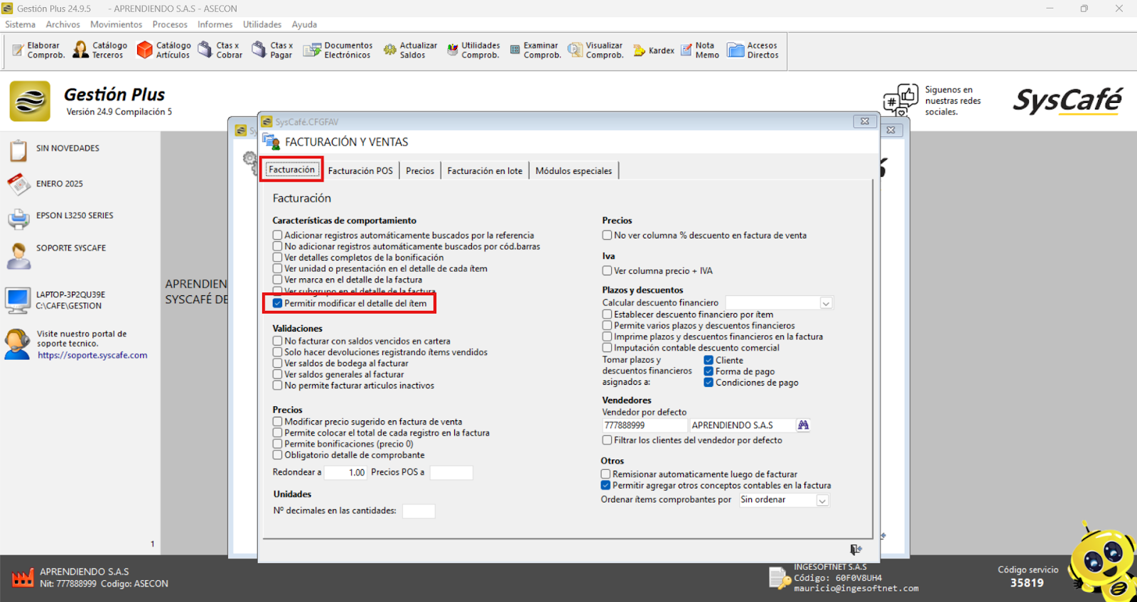 El sistema incluirá la funcionalidad la cual permitirá al usuario activar un parámetro específico que habilita la opción de modificar el detalle de los ítems en las facturas de venta electrónica.