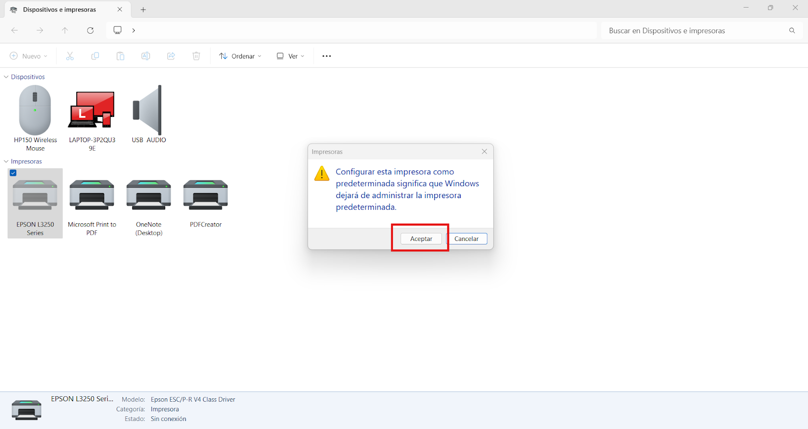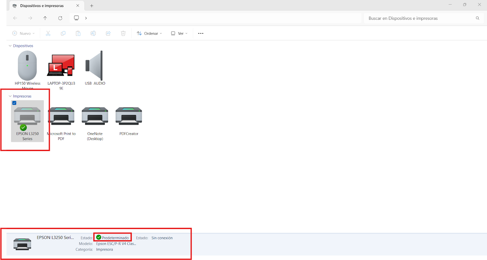 Una vez finalizado el proceso, podrás ver en la configuración de Dispositivos e impresoras que la impresora de tamaño carta ha quedado establecida como predeterminada.