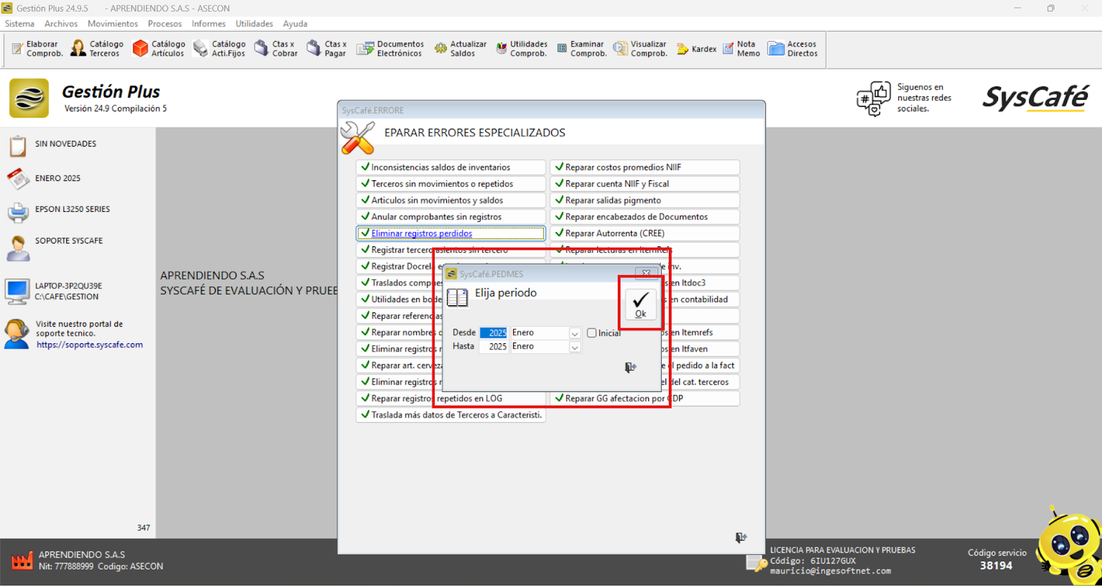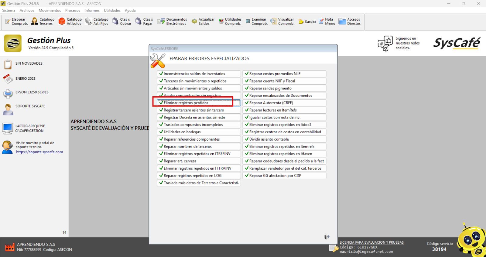 Ruta: Utilidades - Revisión y Auditoría - Buscar errores - Reparaciones Errores Especializados - Eliminar registros Perdidos.