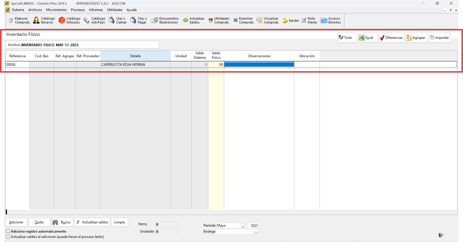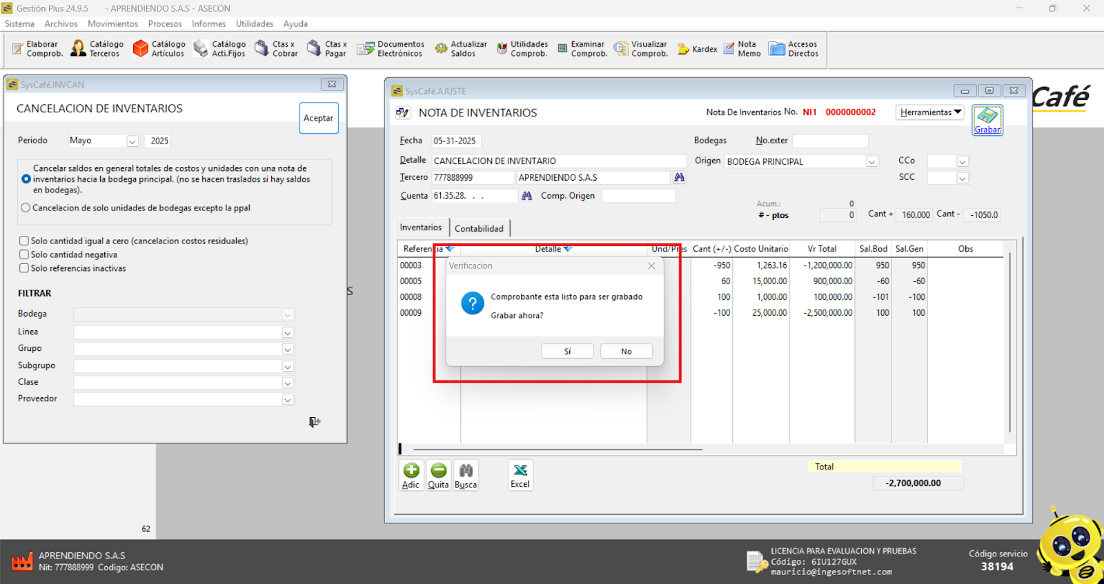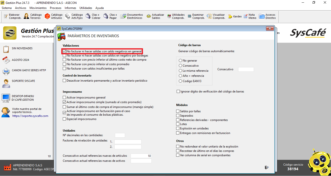 Para optimizar el control de inventarios, recomendamos activar el parámetro que impide facturar o realizar salidas con saldos negativos. Esto ayudará a mantener un control más riguroso sobre los niveles de inventario y evitará discrepancias en los registros.