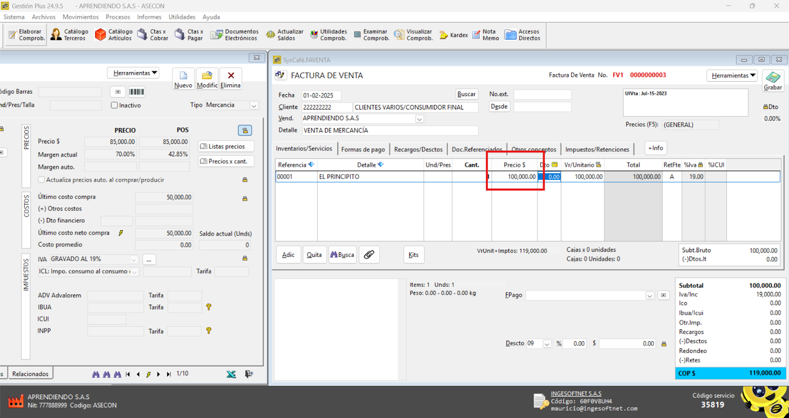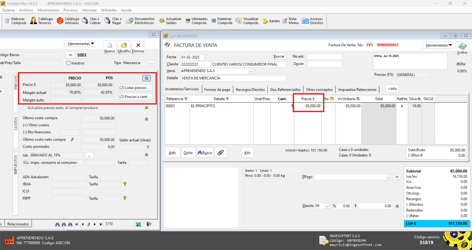 Inicialmente, el sistema mostrará el precio del producto tal como está registrado en el catálogo de Artículos.