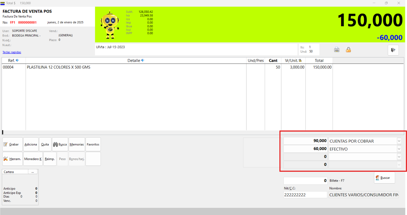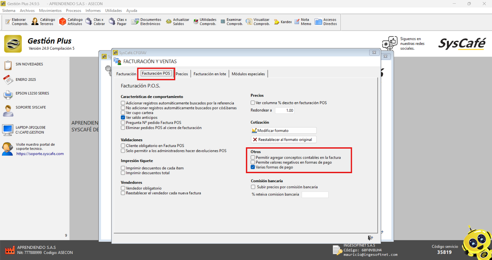 Ruta: Sistema – Parámetros – (Pestaña FACTURACIÓN POS) - Marcar chulito de Varias formas de pago