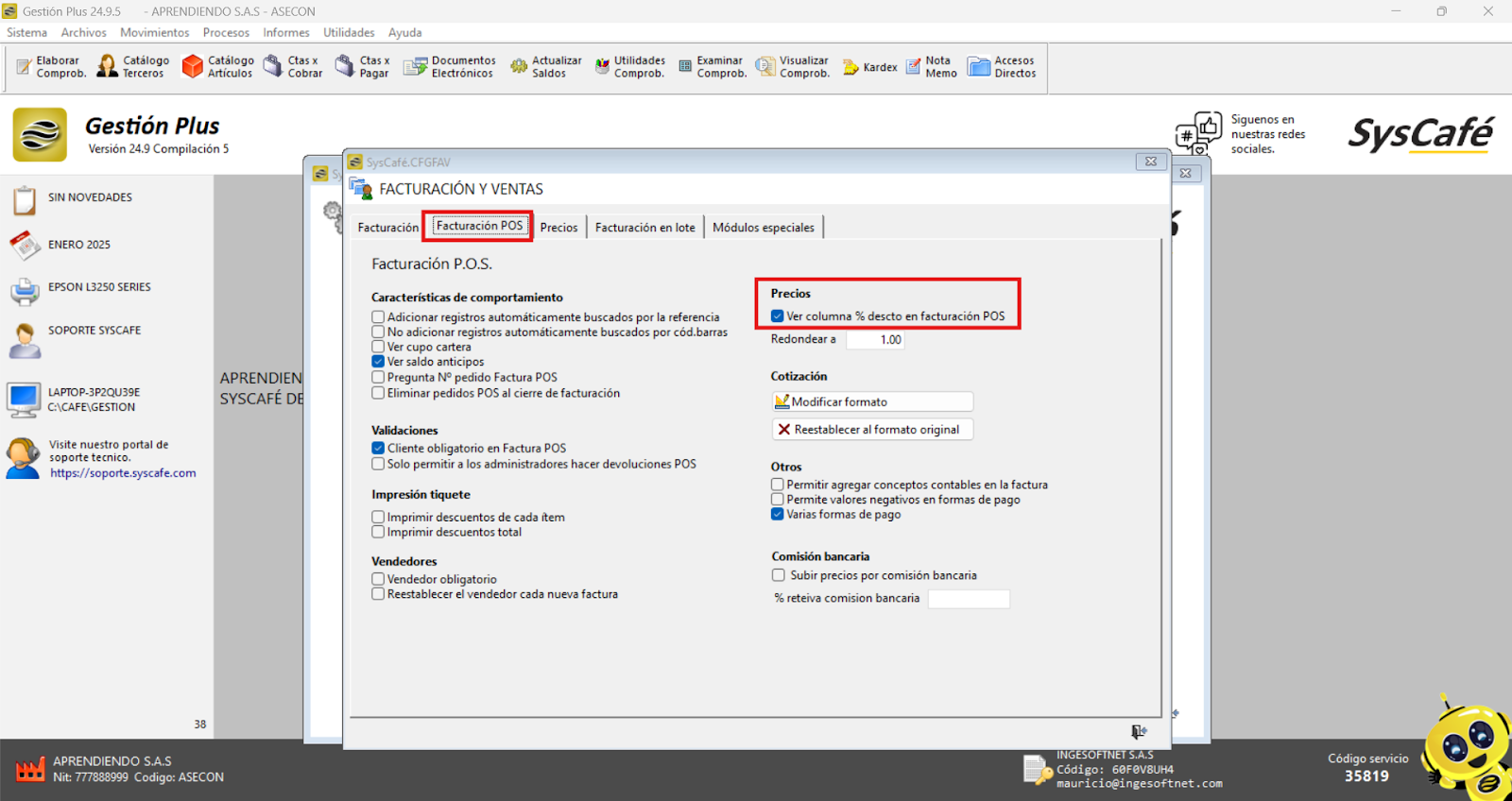 Ruta: Sistema – Parámetros – Facturación POS – Ver columna % descuento en facturación POS