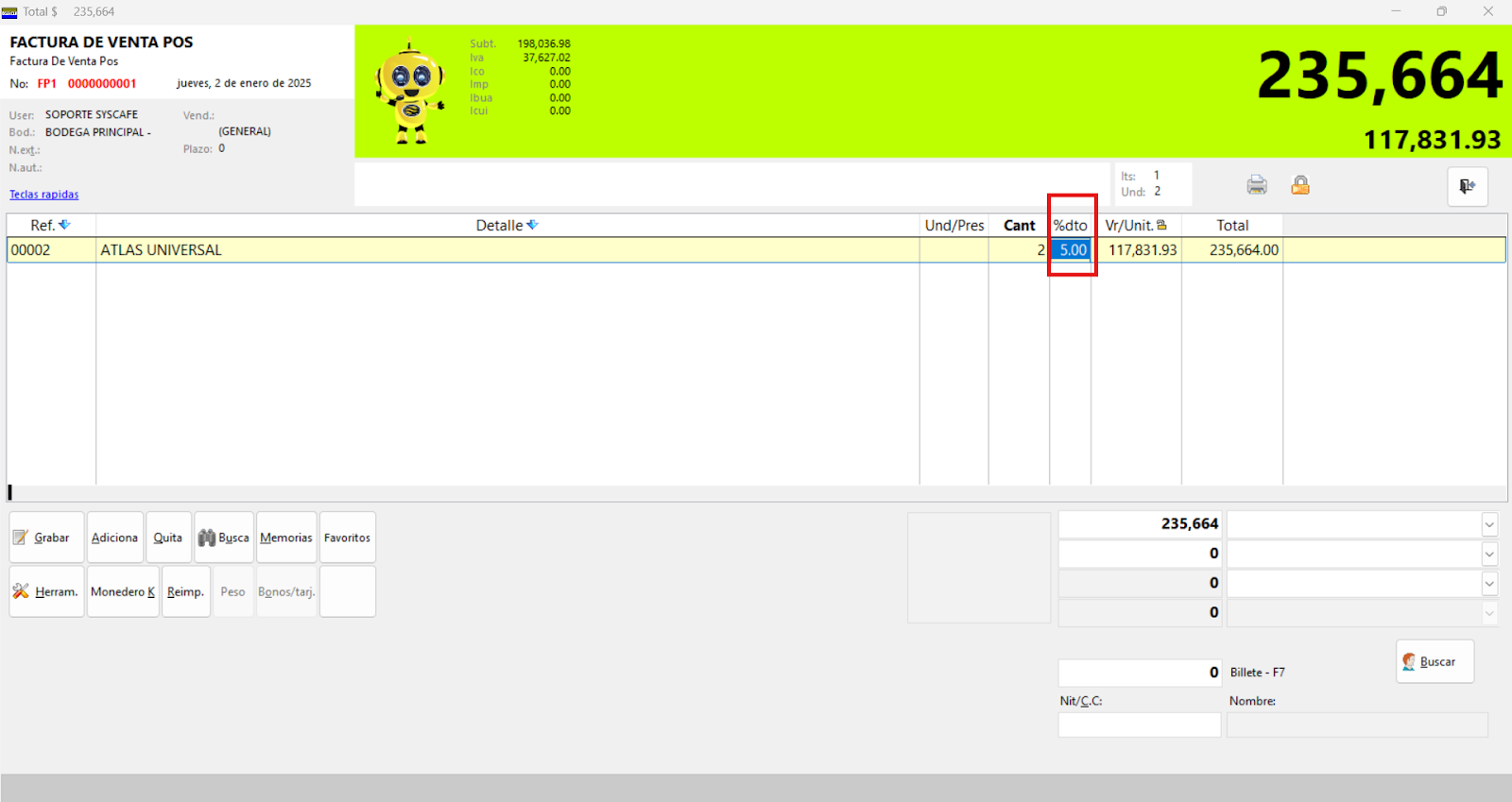 Esta opción proporcionará a los usuarios la capacidad de gestionar descuentos directamente en el momento de realizar una factura, facilitando la aplicación de promociones, ajustes personalizados o condiciones comerciales específicas para cada cliente o transacción.