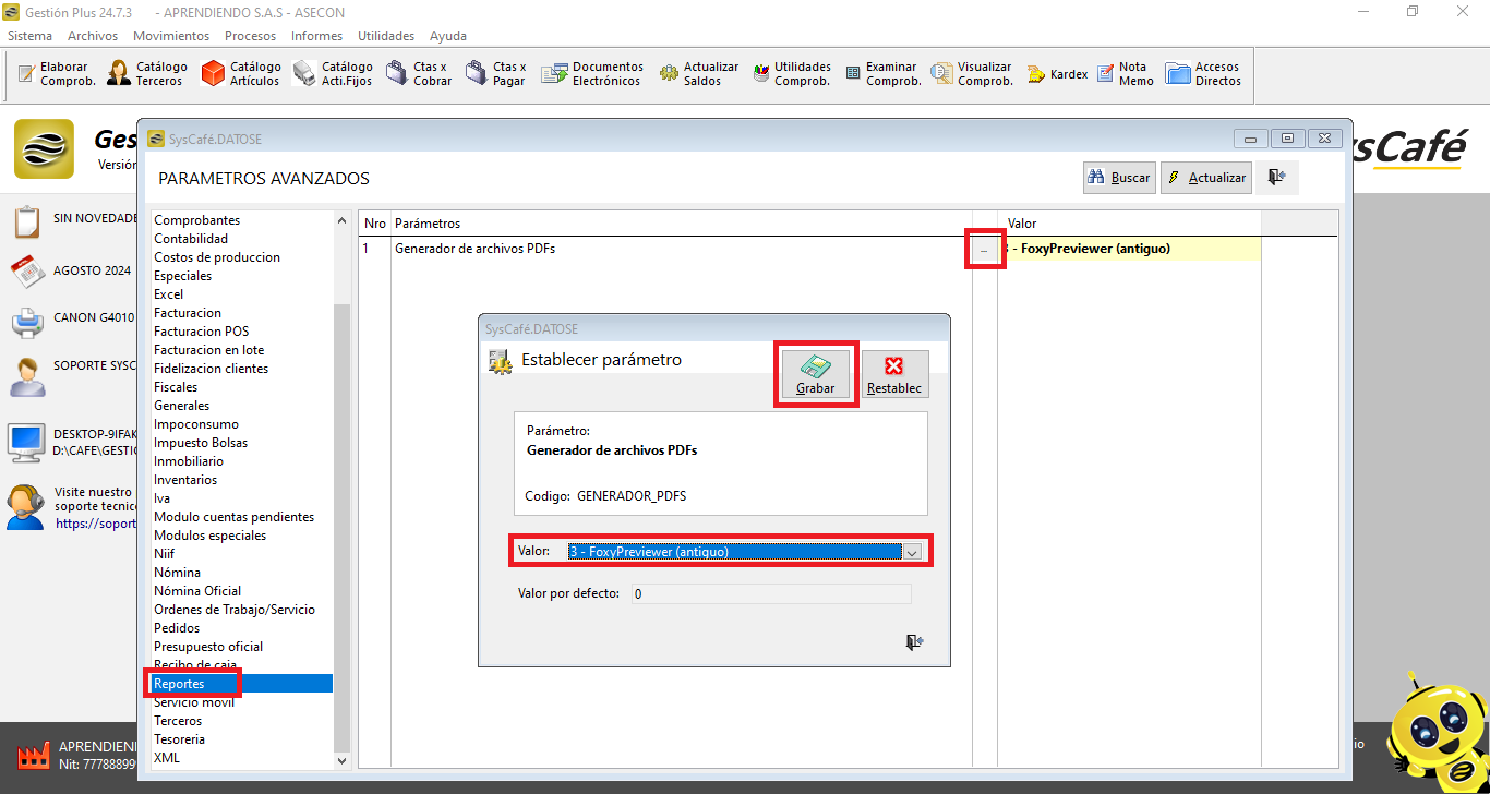 Ruta: Sistema – Parámetros – Parámetros Avanzados – Reportes – Generador de PDF