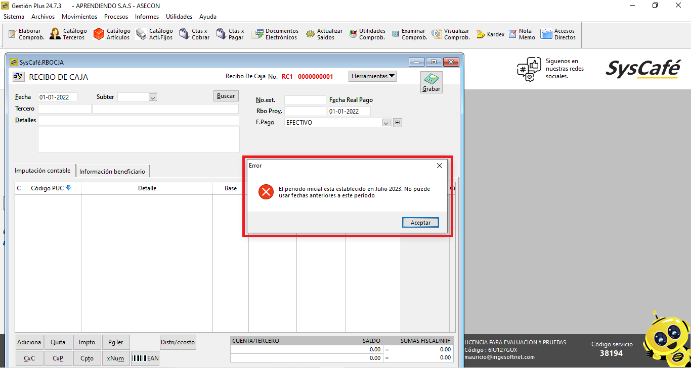 Si necesitas registrar información contable en períodos anteriores al inicial y el sistema muestra el siguiente mensaje: