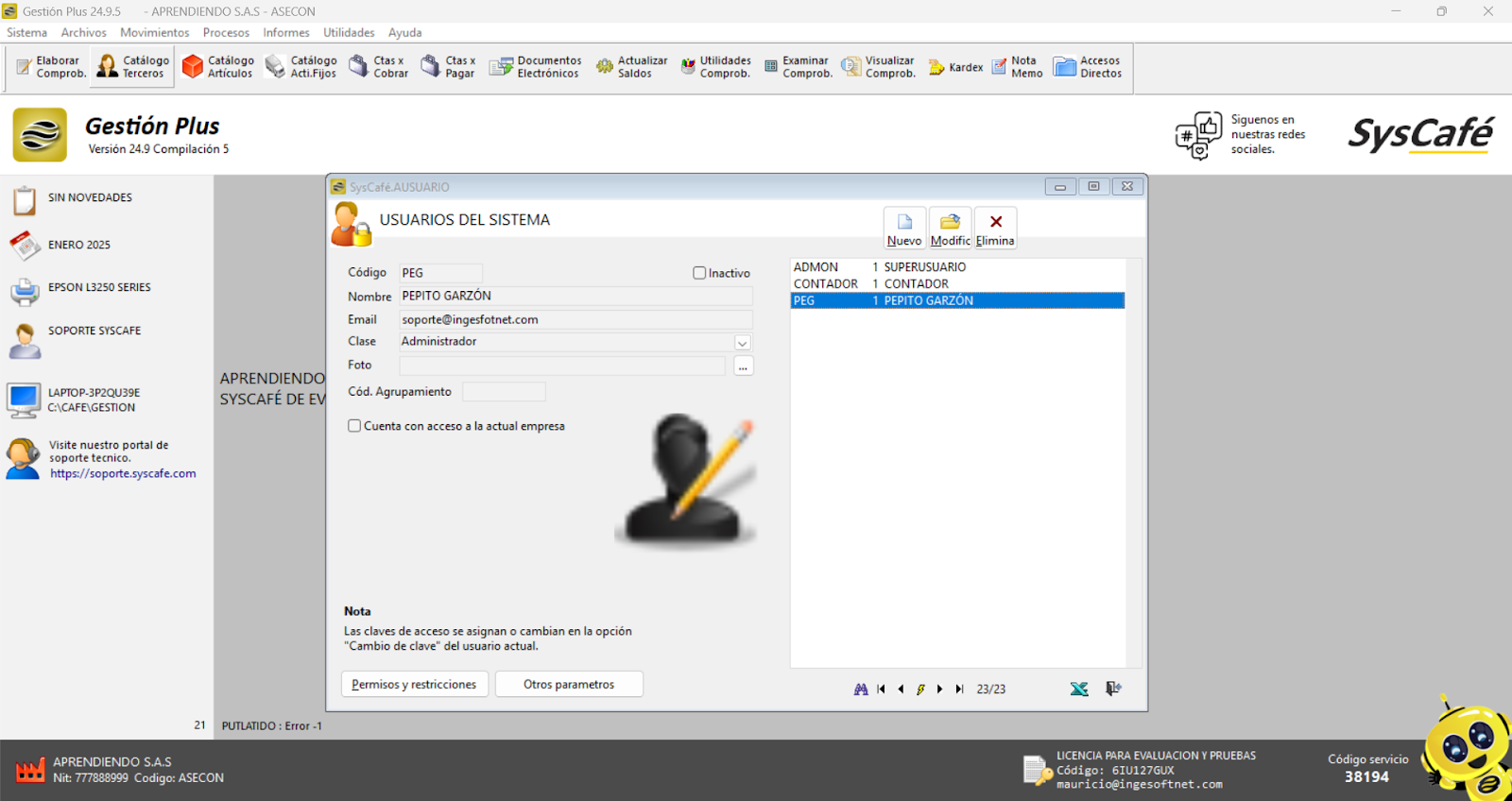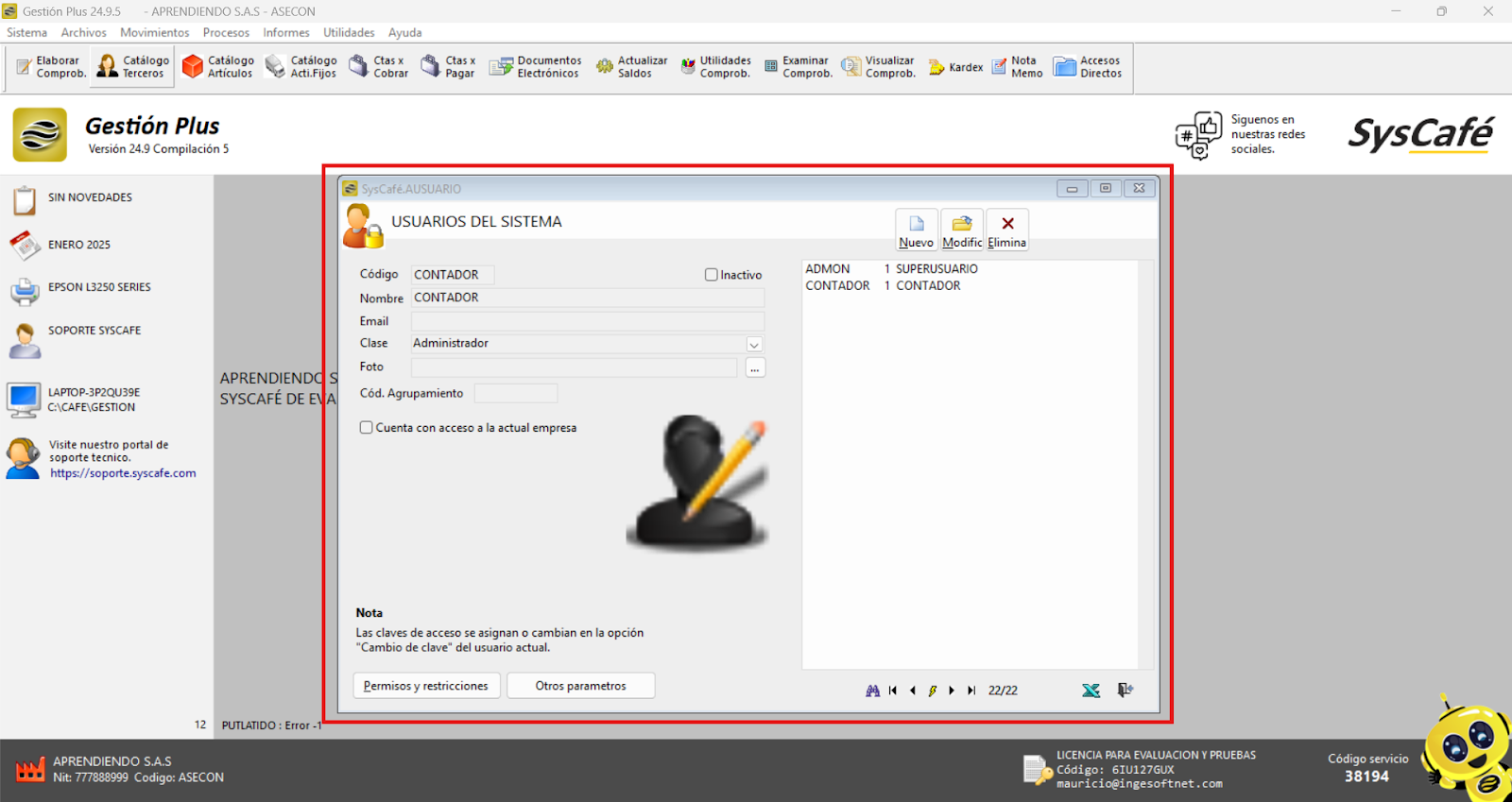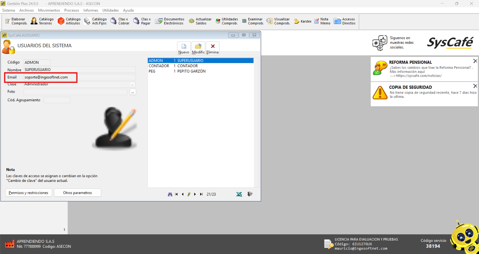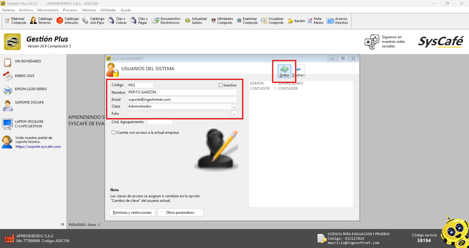 Nota: No es relevante qué correo se registre en el campo, lo importante es que el usuario tenga acceso a dicho correo. La asignación del correo al usuario puede realizarse ingresando al sistema desde cualquier usuario con clase de Administrador.