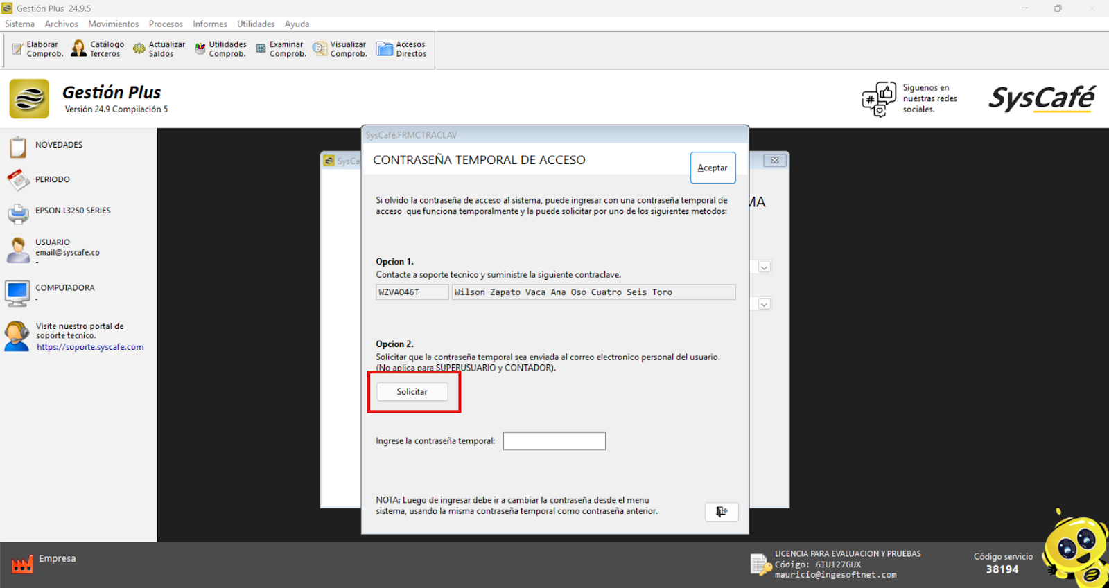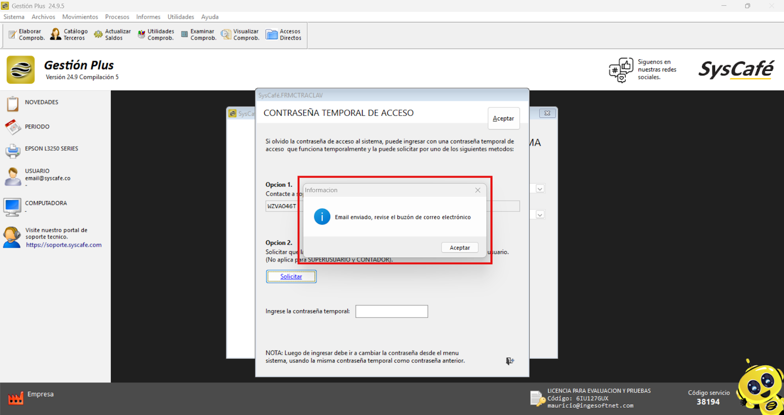 El sistema enviará una contraseña temporal al correo electrónico registrado para permitir el acceso. Es fundamental que el correo esté correctamente ingresado, ya que, de no ser así, la información no será recibida.