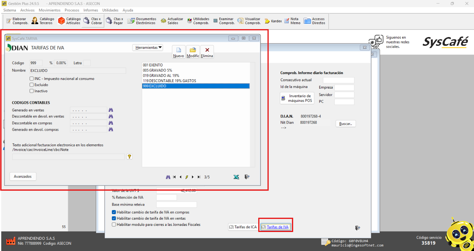 Ruta: Sistema – Parámetros – Fiscales – Botón Tarifas de IVA